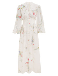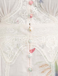 ITEM DETAILS The Lucky Lace Plunge Midi Dress in Cream Bouquet Floral from our Summer Swim 2025 Collection. A linen midi dress with a plunging V-neckline, billowed sleeves with elasticated cuffs, finished with a fitted waistband and flared skirt. - 100% linen fabric - Deep V-neckline - Functional crochet buttons down centre front - Gathered at waist - Partial stand collar with lace detailing - Scalloped edging with lace trim - Centre back invisible zip closure Style Code: 4548DSS252 SIZE DETAILS 0P 0 1 2 3 4 Length 47.5 52.5 53 53 53 53.5 Bust 34.5 37 38.5 41 42.5 45 Waist 26 27 29 30.5 33 34.5 Sleeve 23.5 25 25 25.5 26 26 Designed to be fitted across bust and waist, loose at the hips This garment fits true to size Available in size 0P, suited to clients who are under 5'3"/ 160cm Model is 5'9.5"/178 cm, bust size 32C/10C and wears a size 0 Item measurements are in inches CARE INSTRUCTIONS Main: 100% linen; lining: 100% cotton; lace 1: 100% cotton; lace 2: 100% polyester Dry clean only code f (hydrocarbon only); Remove any detachable trims prior to dry cleaning; Cover to protect trim; Cool iron with protective cloth; Light steam only; Do not spot clean Always check the label or care card for specific care instructions.