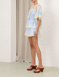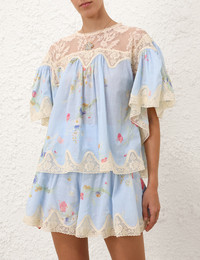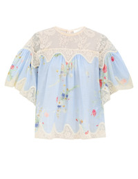 ITEM DETAILS The Lucky Lace Trim Blouse in Blue Bouquet Floral from our Summer Swim 2025 Collection. A cotton blouse featuring a rounded neckline, short ruffled sleeves, finished with a scalloped hem. - 100% cotton fabric - Frill detailing across sleeves, back and hem - Transparent lace detailing across neckline and back - Scalloped edging - Invisible zip closure at centre back Style Code: 3466TSS252 SIZE DETAILS 0P 0 1 2 3 Length 22.5 24 24 24.5 25 Bust 10.5 11 11 11 11 Designed for an oversized, loose fit This garment fits true to size Available in size 0P, suited to clients who are under 5'3"/ 160cm Model is 5'9.5"/178 cm, bust size 32C/10C and wears a size 0 Item measurements are in inches CARE INSTRUCTIONS Main: 100% cotton; contrast: 59. 8% polyamide, 40. 2% cotton Dry clean only code f (hydrocarbon only); Remove any detachable trims prior to dry cleaning; Cover to protect trim; Cool iron with protective cloth; Light steam only; Do not spot clean Always check the label or care card for specific care instructions.