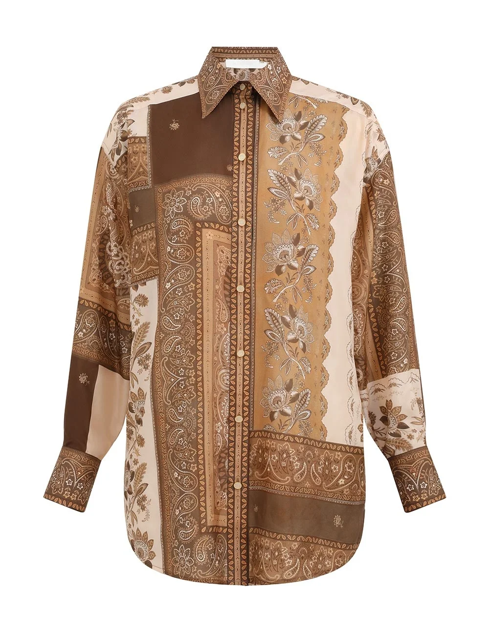ITEM DETAILS The Lucky Manstyle Shirt in Chocolate Bandana from our Summer Swim 2025 Collection. A silk habutae shirt featuring long sleeves, a classic collar and buttons down the centre front. - 100% silk fabric - Relaxed style with loose hem - Gathers on sleeves into cuffs - Gemstone buttons down the centre front and on cuffs Campaign: This style was featured in the Summer Swim 2025 Campaign. Style Code: 4588TSS252 SIZE DETAILS 0P 0 1 2 3 4 Length 29 30.5 31 31 31.5 32 Bust 50.5 52 54.5 56 58.5 60 Sleeve 20 21.5 21.5 21.5 21.5 21.5 Designed for a relaxed fit This garment fits true to size Available in size 0P, suited to clients who are under 5'3"/ 160cm Model is 5'9.5"/178 cm, bust size 32C/10C and wears a size 0 Item measurements are in inches CARE INSTRUCTIONS Main: 100% silk Dry clean only code f (hydrocarbon only); Remove any detachable trims prior to dry cleaning; Cover to protect trim; Cool iron with protective cloth; Light steam only; Do not spot clean Always check the label or care card for specific care instructions.