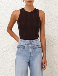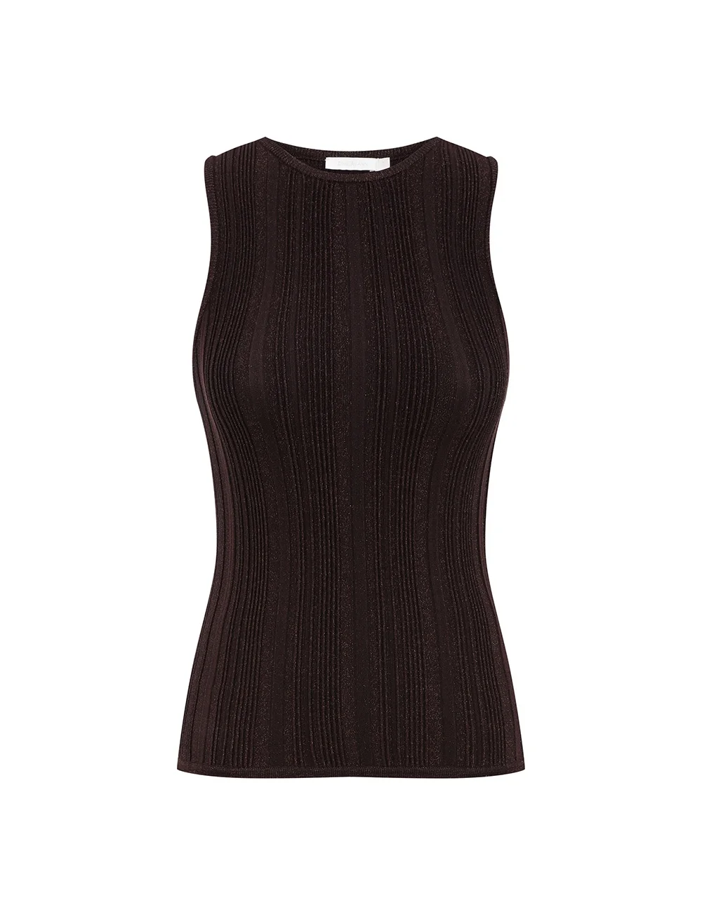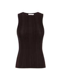 ITEM DETAILS The Lucky Metallic Racer Tank in Metallic Chocolate from our Summer Swim 2025 Collection. A knit tank with a high neckline at the front and back. - Slim fit tank - Metallic finish - Racer neckline Style Code: 4314TSS252 SIZE DETAILS 0P 0 1 2 3 Length 19.5 20.5 21 21.5 21.5 Bust 19 21.5 23 25 27 Waist 17.5 19.5 21.5 23.5 25 Designed to fit close to the body This garment fits true to size Available in size 0P, suited to clients who are under 5'3"/ 160cm Model is 5'9.5"/178 cm, bust size 32C/10C and wears a size 0 Item measurements are in inches CARE INSTRUCTIONS 68% viscose 22% polyamide 8% metallized fibre 2% elastane Gentle cold hand wash separately with mild detergent Remove any detachable trims prior to cleaning Cover to protect trim; Do not soak, rub or wring Do not bleach Do not tumble dry Dry flat in shade Cool iron with protective cloth Do not spot clean; Store garment flat do not hang Dry cleanable code f (hydrocarbon only) Always check the label or care card for specific care instructions.