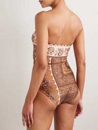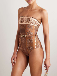 EDITORS'NOTES Zimmermann's swimsuit is cut from stretch fabric that's artfully printed with bandana-inspired paisley swirls. The strapless design comes with an embellished belt to cinch the waist. SIZE & FIT - 0 = UK 8/ US 4/ FR 36 - 1 = UK 10/ US 6/ FR 38 - 2 = UK 12/ US 8/ FR 40 - 3 = UK 14/ US 10/ FR 42 - 4 = UK 16/ US 12/ FR 44 - Fits true to size, take your normal size - Full brief coverage - Model is 177cm/ 5'10", bra size 32B and is wearing the designer's size 0 DETAILS & CARE - Tonal-brown stretch-polyamide - Pulls on - 80% polyamide, 20% elastane - Designer color: Chocolate Bandana - Lotion, sunscreen, oil and chlorine can cause discoloration of this item; this is not a manufacturing defect. Please follow care instructions to keep your swimwear in the best condition