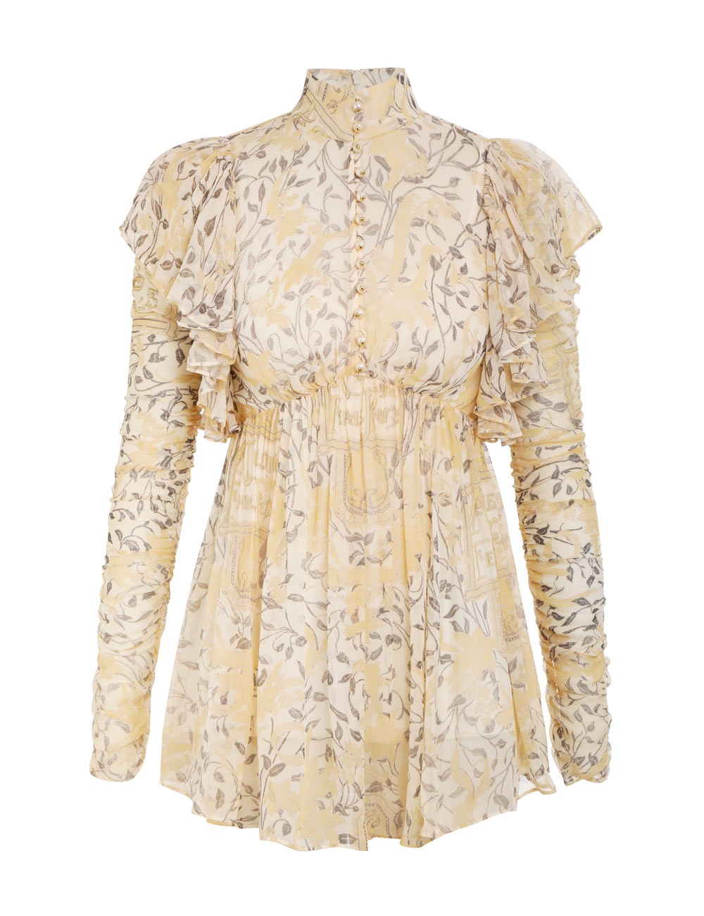 ITEM DETAILS The Luminosity Gathered Blouse in Book Cover Gold/Cream from our Fall 2023 Collection, Luminosity. A long sleeve blouse featuring buttons down the centre front. - Long sleeve printed blouse - Gathered sleeves - High neck collar - Comes with a separate slip Style Code: 8056TF231 SIZE DETAILS 0P 0 1 2 3 Length 67 72 72 73 74 Bust 84 90 94 100 104 Waist 30 32 34 38 40 Sleeve 59 63 63 64 65 Fitted through the sleeve, relaxed through the body This garment fits true to size Available in size 0P, suited to clients who are under 5'3"/ 160cm Model is 5'9.5"/178 cm, bust size 32C/10C and wears a size 0 Item measurements have been rounded to the nearest cm. CARE INSTRUCTIONS Main: 100% viscose Exclusive of trims Slip: 86% recycled post-consumer polyester 14% elastane Exclusive of trims Main: Dry clean only code f with protective bag Cool iron with protective cloth Light steam only Do not spot clean Turn garment inside out before dry cleaning Slip: Dry clean only code p with protective bag Cool iron with clean cover cloth Do not spot clean Cover and protect hardware Turn garment inside out before dry cleaning Always check the garment care label for specific care instructions.