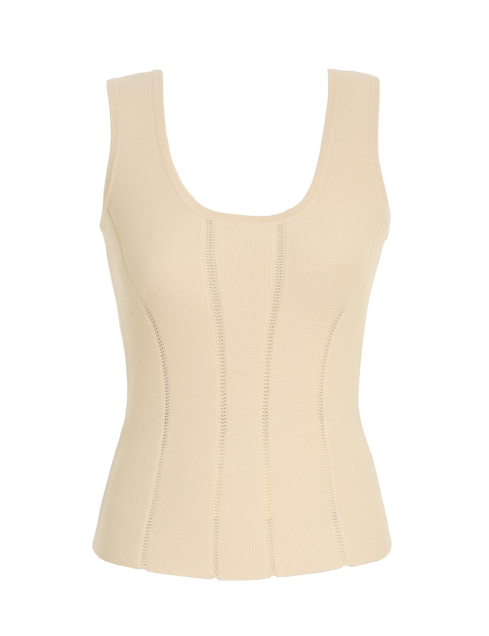 ITEM DETAILS The Luminosity Knit Panelled Tank in Cream from our Fall 2023 Collection, Luminosity. A knit tank featuring a pointelle stitch detail throughout. - Sleeveless knit top - Scoop neck - Fixed straps - Slip on style Style Code: 7762TF231 SIZE DETAILS 0P 0 1 2 3 Length 22 24 25 26 28 Bust 68 74 78 84 90 Waist 62 68 72 78 84 Fitted throughout This garment fits true to size Available in size 0P, suited to clients who are under 5'3"/ 160cm Model is 5'9.5"/178 cm, bust size 32C/10C and wears a size 0 Item measurements have been rounded to the nearest cm. CARE INSTRUCTIONS 78% viscose 22% polyamide Exclusive of trims Gentle hand wash separately with mild detergent Do not bleach Do not soak, wring or rub Do not tumble dry Dry flat inside out, away from direct sunlight Cool iron on reverse Store garment flat, do not hang Dry cleanable code f Always check the garment care label for specific care instructions.