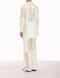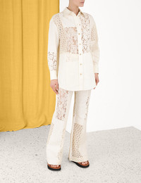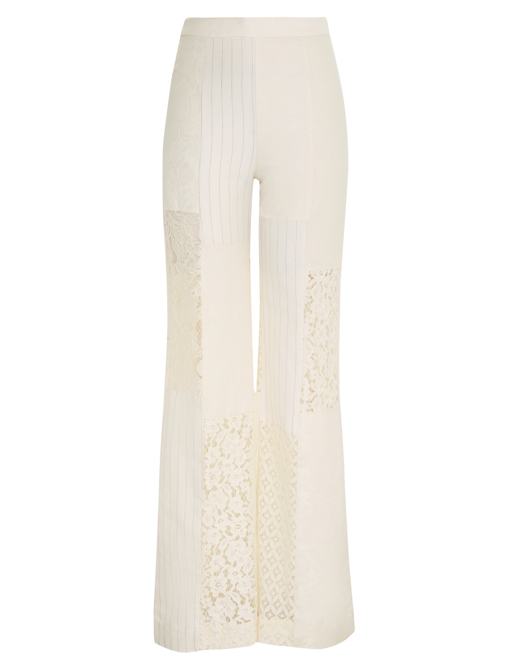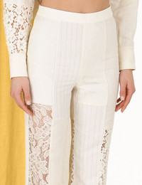 ITEM DETAILS The Luminosity Patch Lace Pant in Cream from our Fall 2023 Collection, Luminosity. A linen blend pant featuring a high waisted, wide leg silhouette, finished with spliced panels of lace throughout. - Linen blend pant - Fixed high waist - Cotton voile binding - Invisible zip closure Style Code: 8083PF231 SIZE DETAILS 0P 0 1 2 3 Length 102 113 114 115 115 Waist 64 66 72 78 82 Hip 86 92 96 102 108 Inseam 76 85 85 85 85 Fitted high waist Relaxed through legs This garment fits true to size Available in size 0P, suited to clients who are under 5'3"/ 160cm Model is 5'9.5"/178 cm, bust size 32C/10C and wears a size 0 Item measurements have been rounded to the nearest cm. CARE INSTRUCTIONS Main: 52% linen 48% silk Exclusive of trims Dry clean only code f with protective bag Cool iron with protective cloth Light steam only Do not spot clean Turn garment inside out before dry cleaning Always check the garment care label for specific care instructions.