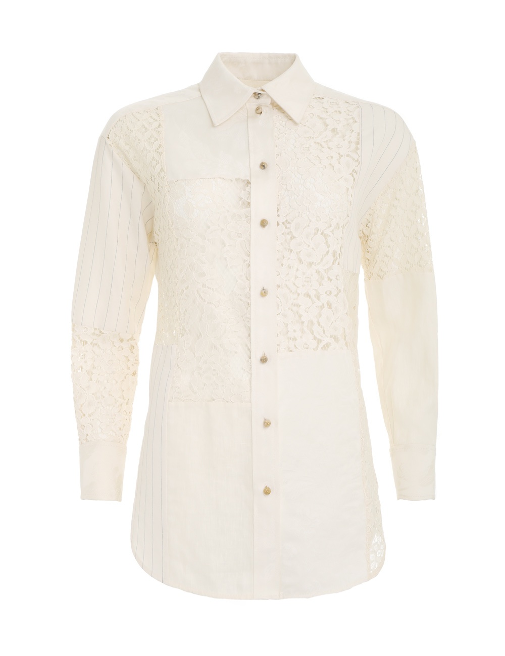 ITEM DETAILS The Luminosity Patch Lace Shirt in Cream from our Fall 2023 Collection, Luminosity. A cotton blend shirt featuring spliced panels of lace and pinstripe linen throughout. - Cotton blend shirt - Classic collar - Buttons down centre front and cuff - Box pleat at back Style Code: 8082TF231 SIZE DETAILS 0P 0 1 2 3 Length 70 76 76 77 78 Bust 108 112 118 124 128 Sleeve 50 53 53 54 54 Relaxed fit This garment fits true to size Available in size 0P, suited to clients who are under 5'3"/ 160cm Model is 5'9.5"/178 cm, bust size 32C/10C and wears a size 0 Item measurements have been rounded to the nearest cm. CARE INSTRUCTIONS Main: 55% cotton 45% linen Exclusive of trims Dry clean only code f with protective bag Cool iron with protective cloth Light steam only Do not spot clean Cover and protect hardware Turn garment inside out before dry cleaning Always check the garment care label for specific care instructions.