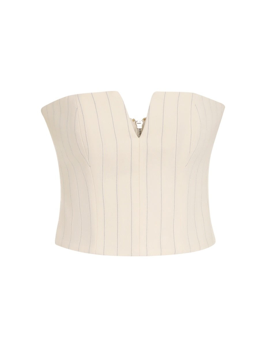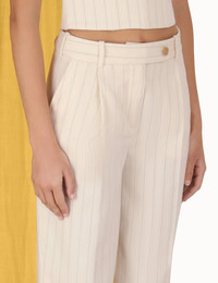ITEM DETAILS The Luminosity Pleat Front Pant in Cream Stripe from our Fall 2023 Collection, Luminosity. A straight leg pant featuring pleats down the centre front and side pockets. - Wool blend pant - High waisted - Bar and hook closure - Front fly - Belt loops Style Code: 8131PF231 SIZE DETAILS 0P 0 1 2 3 4 Length 98 109 110 110 111 112 Waist 72 74 80 86 90 96 Hip 102 106 112 116 122 126 Inseam 77 86 86 86 86 86 Straight fit throughout This garment fits true to size Available in size 0P, suited to clients who are under 5'3"/ 160cm Model is 5'9.5"/178 cm, bust size 32C/10C and wears a size 0 Item measurements have been rounded to the nearest cm. CARE INSTRUCTIONS Main: 86% wool 14% cotton Exclusive of trims Dry clean only code f with protective bag Cool iron with protective cloth Do not spot clean Cover and protect hardware Turn garment inside out before dry cleaning Always check the garment care label for specific care instructions.