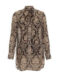 ITEM DETAILS The Luminosity Tubular Shirt in Black Damask from our Fall 2023 Collection, Luminosity. A relaxed shirt featuring long sleeves with buttoned cuffs and a self tie neck. - Relaxed shirt - Buttons down centre front - Removable neck tie - Comes with separate cami Style Code: 8063TF231 SIZE DETAILS 0P 0 1 2 3 4 Length 75 79 80 81 81 82 Bust 96 102 106 112 116 122 Sleeve 57 61 62 63 63 64 Relaxed fit This garment fits true to size Available in size 0P, suited to clients who are under 5'3"/ 160cm Model is 5'9.5"/178 cm, bust size 32C/10C and wears a size 0 Item measurements have been rounded to the nearest cm. CARE INSTRUCTIONS 100% viscose Exclusive of trims Slip: 86% recycled post-consumer polyester 14% elastane Exclusive of trims Main: Dry clean only code f with protective bag Cool iron with protective cloth Light steam only do not spot clean Turn garment inside out before dry cleaning Slip: Dry clean only code p with protective bag Cool iron with clean cover cloth Do not spot clean Cover and protect hardware Turn garment inside out before dry cleaning Always check the garment care label for specific care instructions.