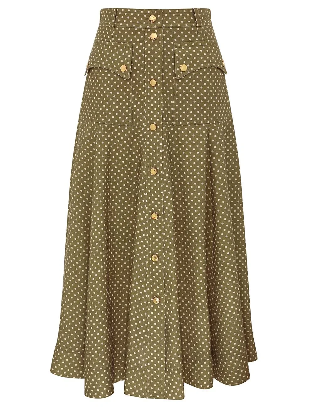 ITEM DETAILS The Luna Cargo Midi Skirt in Olive Dot from our Spring 2026 Collection, Kindred Spirit. A linen midi skirt featuring a fixed high waistband with belt loops, centre front gold buttons, finished with front hip pockets and a flared hem. - Linen fabric - Fixed, high-rise waist - Pleated skirt - Front flap pockets with buttons - Invisible centre back zip - Topstitching throughout - Lined Style Code: 8082SS261 SIZE DETAILS 0P 0 1 2 3 4 Length 32 35 35 35 35 35 Waist 25 26 28.5 30.5 32.5 34.5 Hip 37 39.5 41 43.5 45 47 Fitted at the waist and hips, relaxed through the legs Heavy-weight, non-stretchy fabric This garment fits true to size Available in size 0P, suited to clients who are under 5'3"/ 160cm Model is 5'9.5"/178 cm, bust size 32C/10C and wears a size 0 Item measurements are in inches CARE INSTRUCTIONS Main: 100% linen; lining: 100% cotton Dry clean only code f (hydrocarbon only); Remove any detachable trims prior to dry cleaning; Cover to protect trim; Iron in low temperature with protective cloth; Light steam only; Do not spot clean Always check the label or care card for specific care instructions.