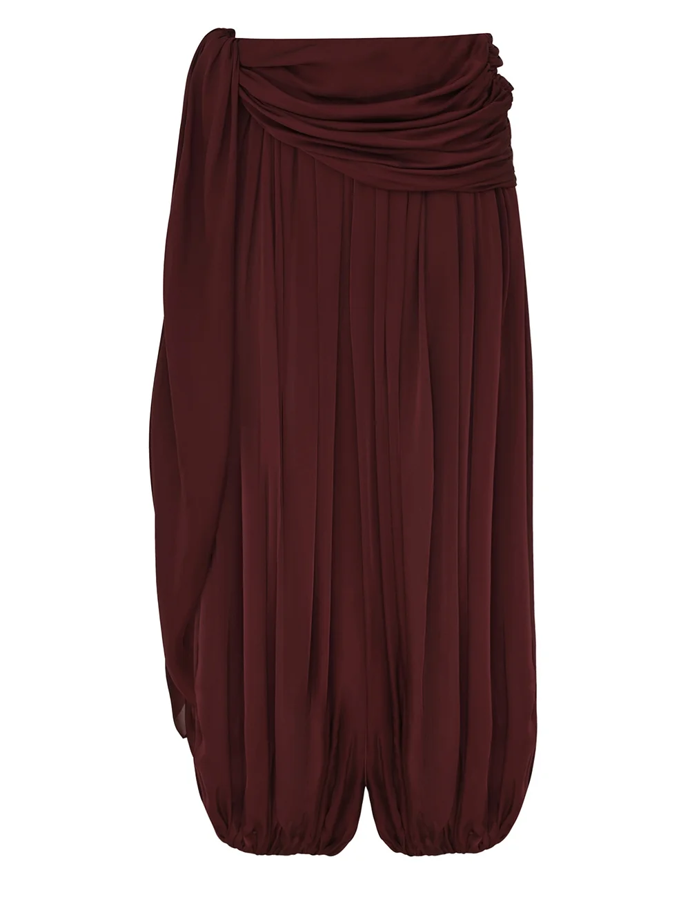 ITEM DETAILS The Luna Draped Harem Pant in Wine from our Spring 2026 Collection, Kindred Spirit. A silk harem pant featuring a fixed waistband with exaggerated side tie, invisible zip closure, finished with fitted cuffs and heavy gathering throughout. - Silk fabric - Mid-rise, ankle-length pant - Draped, asymmetric waistband - Fixed right-side tie - Invisible right-side zip - Elasticated cuffs allow for flexible pant length Style Code: 8796PS261 SIZE DETAILS 0P 0 1 2 3 4 Length 35.5 40 40 40 40.5 41 Waist 27.5 28.5 30.5 32.5 34.5 36 Inseam 24.5 28 28 28 28 28 Relaxed fit Light-weight, non-stretchy fabric Mid-rise waist with an ankle-length pant This garment fits true to size Available in size 0P, suited to clients who are under 5'3"/ 160cm Model is 5'9.5"/178 cm, bust size 32C/10C and wears a size 0 Item measurements are in inches CARE INSTRUCTIONS Main: 100% silk Dry clean only code f (hydrocarbon only); Remove any detachable trims prior to dry cleaning; Cover to protect trim; Iron in low temperature with protective cloth; Light steam only; Do not spot clean Always check the label or care card for specific care instructions.