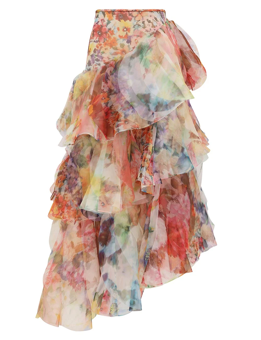 ITEM DETAILS The Luna Fanned Maxi Skirt in Spliced Floral from our Spring 2026 Collection, Kindred Spirit. A maxi length skirt featuring a fitted waistband and invisible side zip closure, finished with tiered frills throughout. - Mid-rise, maxi length skirt - Fixed waist panel - Self rouleau loops at sides - Invisible zip at right side - Asymmetric hem - Cascading ruffles throughout - Printed lining Style Code: 8167SS261 SIZE DETAILS 0P 0 1 2 3 4 Length 36 39 39 39 39 39 Waist 26 27.5 29 31.5 33 35.5 Hip 35.5 37 39.5 41 43.5 45.5 Fitted at the waist and hips Mid-weight, non-stretchy fabric This garment fits true to size Available in size 0P, suited to clients who are under 5'3"/ 160cm Model is 5'9.5"/178 cm, bust size 32C/10C and wears a size 0 Item measurements are in inches CARE INSTRUCTIONS Main: 100% polyester; lining: 100% viscose; crinoline: 100% polyester Dry clean only code f (hydrocarbon only); Remove any detachable trims prior to dry cleaning; Cover to protect trim; Iron in low temperature with protective cloth; Light steam only; Do not spot clean Always check the label or care card for specific care instructions.