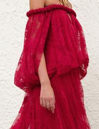 ITEM DETAILS The Luna Lace Billow Gown in Fuchsia from our Spring 2026 Collection, Kindred Spirit. A maxi gown featuring off-the-shoulder billow sleeves, a plunging V-neckline with braided trim detailing, finished with an invisible zip closure and heavy gathering throughout. - Full-length gown - Long sleeves with front slits - Twisted detailing at neckline - Elasticated cuffs - Invisible left-side zip - Lace scalloped trim - Nude lining Style Code: 8743DS261 SIZE DETAILS 0P 0 1 2 3 4 Length 45 49 49 49 49 49 Bust 26 28.5 30 32.5 34 36 Hip 34.5 37 39.5 41 43.5 45 Sleeve 8.5 8.5 9 9.5 10 10 Relaxed fit Elasticated at the hips for a flexible fit Heavy-weight, non-stretchy fabric This garment fits true to size Available in size 0P, suited to clients who are under 5'3"/ 160cm Model is 5'9.5"/178 cm, bust size 32C/10C and wears a size 0 Item measurements are in inches CARE INSTRUCTIONS Main: 60% polyamide, 40% cotton; lining: 100% viscose; crinoline: 100% polyester Dry clean only code f (hydrocarbon only); Remove any detachable trims prior to dry cleaning; Cover to protect trim; Do not steam; Iron in low temperature with protective cloth; Do not spot clean Always check the label or care card for specific care instructions.
