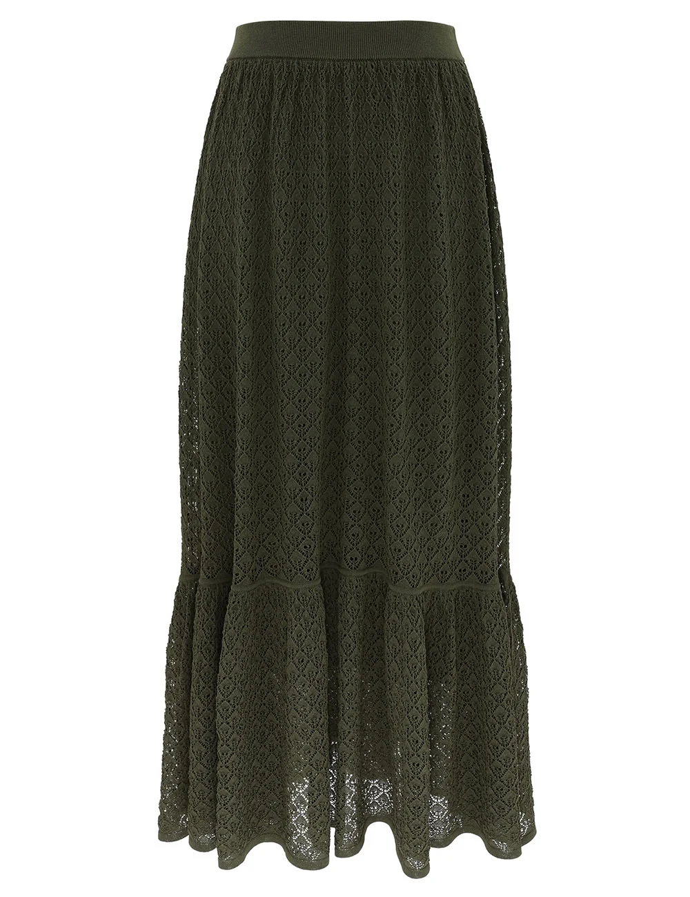ITEM DETAILS The Luna Lace Knit Maxi Skirt in Olive from our Spring 2026 Collection, Kindred Spirit. A knit maxi skirt featuring an elasticated waistband and pleated frill hem. - Mid-rise, full-length skirt - Elasticated waistband panel - All-over crochet detailing - Heavily gathered - Slip on style - Lined Style Code: 7628SS261 SIZE DETAILS 0P 0 1 2 3 4 Length 32 35.5 35.5 35.5 35.5 35.5 Waist 20.5 21.5 23.5 26 27.5 30 Hip 56 57.5 60 62 64 66 Elasticated waist for a flexible fit Mid-rise waist with a full-length skirt This garment fits true to size Available in size 0P, suited to clients who are under 5'3"/ 160cm Model is 5'9.5"/178 cm, bust size 32C/10C and wears a size 0 Item measurements are in inches CARE INSTRUCTIONS Main: 56% paper yarn, 44% polyester; lining: 100% viscose Dry clean only code f (hydrocarbon only); Remove any detachable trims prior to dry cleaning; Cover to protect trim; Iron in low temperature with protective cloth; Do not spot clean; Store garment flat do not hang Always check the label or care card for specific care instructions.