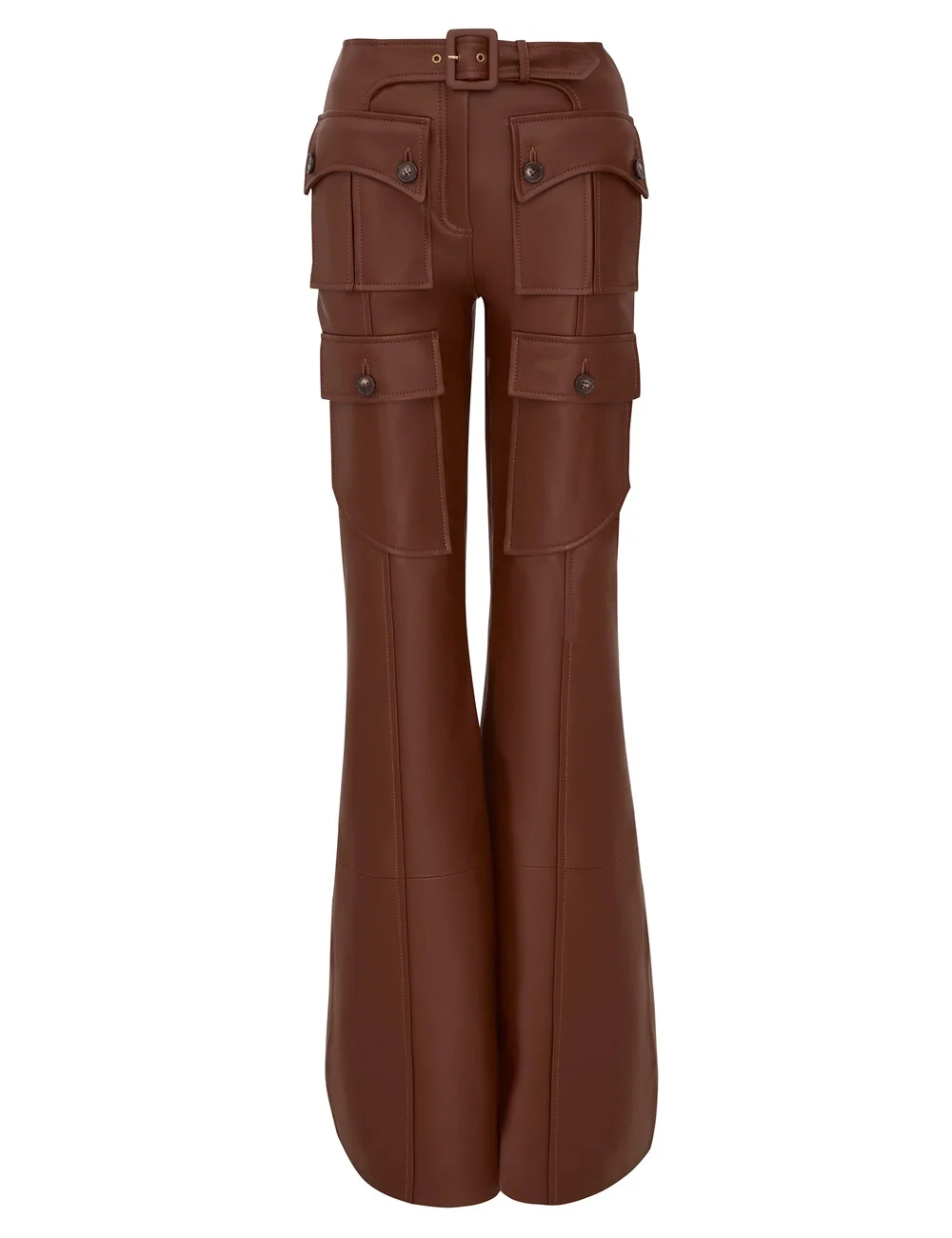 ITEM DETAILS The Luna Leather Flare Pant in Radical Brown from our Spring 2026 Collection, Kindred Spirit. A leather full-length pant featuring a mid-rise waistband, belt and front flap pockets with snap closures. - Sheepskin nappa leather - Mid-rise, full-length pant - Sewn in waist belt with buckle - Centre front fly closure - Front flap pockets - Topstitching throughout Style Code: 8500PS261 SIZE DETAILS 0P 0 1 2 3 4 Length 41.5 45.5 46 46 46.5 47 Waist 25 27 29 30.5 33 34.5 Hip 34 35.5 38 39.5 41.5 44 Inseam 10 11 11.5 12 12 12.5 Tailored fit Mid-rise waist with a full-length pant Mid-weight, non-stretchy fabric This garment fits true to size Available in size 0P, suited to clients who are under 5'3"/ 160cm Model is 5'9.5"/178 cm, bust size 32C/10C and wears a size 0 Item measurements are in inches CARE INSTRUCTIONS Main: sheep leather; lining: 75% viscose, 25% silk Clean professionally by a specialist leather and suede expert; Do not dry clean; Avoid water; Due to the nature of this garment colour may transfer onto clothing, accessories or furnishings Always check the label or care card for specific care instructions.