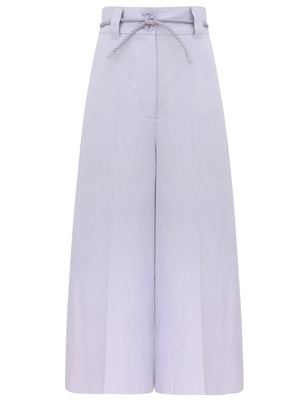 ITEM DETAILS The Luna Linen Culotte in Lilac from our Spring 2026 Collection, Kindred Spirit. A linen pant featuring a mid-rise waistband with belt loops, concealed front fly closure and wide flare hem. - Linen fabric - Mid-rise, cropped length pant - Thick, fixed waistband - Removable braided tie with clasp closure - Double centre front buttons - Concealed metal zip - Back welt pockets Style Code: 7391PS261 SIZE DETAILS 0P 0 1 2 3 4 Length 31 33.5 34 34.5 34.5 34.5 Waist 26 27.5 29 31.5 33 35.5 Hip 36 38 39.5 41.5 44 45.5 Inseam 20.5 22 22 22 22 22 Fitted at the waist, relaxed through the legs Mid-rise waist with a cropped length pant Heavy-weight, non-stretchy fabric This garment fits true to size Available in size 0P, suited to clients who are under 5'3"/ 160cm Model is 5'9.5"/178 cm, bust size 32C/10C and wears a size 0 Item measurements are in inches CARE INSTRUCTIONS Main: 100% linen; pocketing: 75% viscose, 25% silk Dry clean only code f (hydrocarbon only); Remove any detachable trims prior to dry cleaning; Cover to protect trim; Iron in low temperature with protective cloth; Light steam only; Do not spot clean Always check the label or care card for specific care instructions.