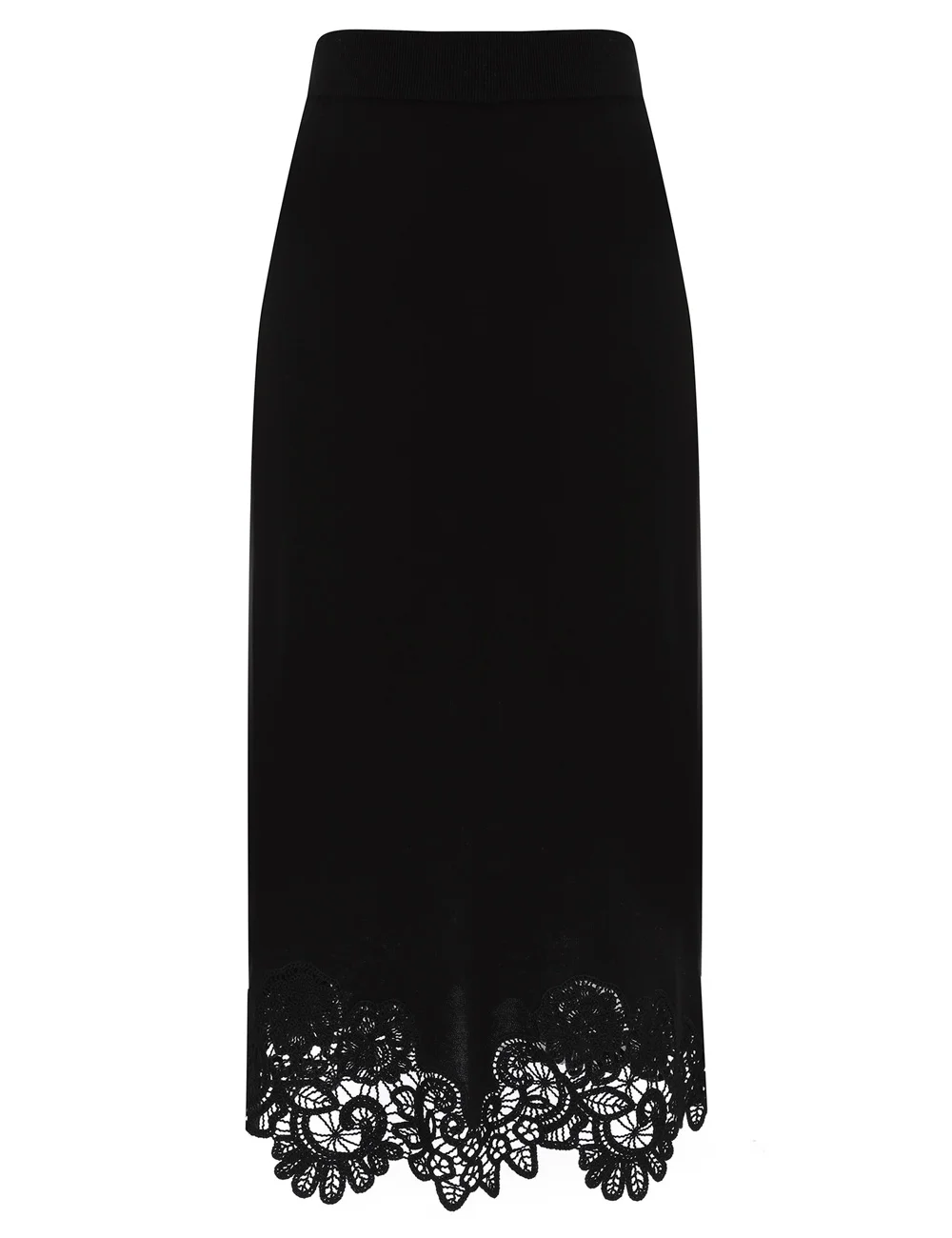 ITEM DETAILS The Luna Merino Lace Midi Skirt in Black from our Spring 2026 Collection, Kindred Spirit. A wool knit midi skirt featuring an elasticated waistband and scalloped lace trim. - Wool mid-rise, midi-length skirt - Elasticated waistband panel - Scalloped embroidered trim - Asymmetric hem - Slip on style Style Code: 8919SS261 SIZE DETAILS 0P 0 1 2 3 4 Length 30.5 33.5 33.5 33.5 33.5 33.5 Waist 23.5 24.5 27 29 30.5 33 Hip 30 31.5 34 36 38 40 Elasticated waist for a flexible fit Mid-rise waist with a mid-length skirt Mid-weight, stretchy fabric This garment fits true to size Available in size 0P, suited to clients who are under 5'3"/ 160cm Model is 5'9.5"/178 cm, bust size 32C/10C and wears a size 0 Item measurements are in inches CARE INSTRUCTIONS 100% wool Dry clean only code f (hydrocarbon only); Remove any detachable trims prior to dry cleaning; Cover to protect trim; Iron in low temperature with protective cloth; Do not spot clean; Store garment flat do not hang Always check the label or care card for specific care instructions.