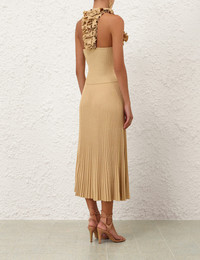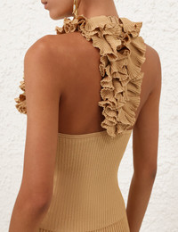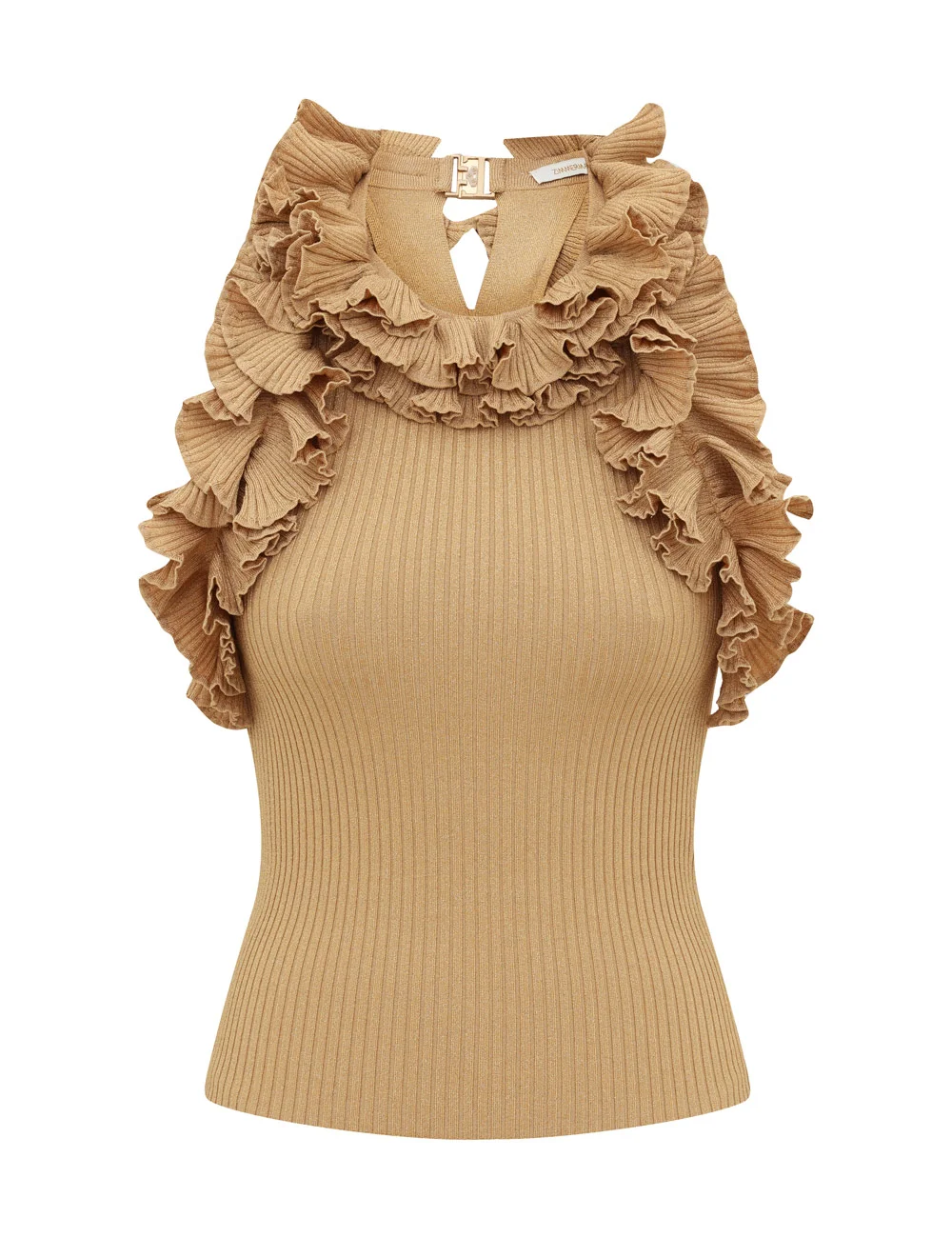 ITEM DETAILS The Luna Metallic Ruffle Tank in Metallic Gold from our Spring 2026 Collection, Kindred Spirit. A knit tank featuring a high crew neckline, racer back and ruffle trim. - Sleeveless, metallic knit top - Ruffle trim at the neckline, armholes and racerback - Upper back swim clasp - Ribbed throughout - Exposed mid-back Style Code: 9527TS261 SIZE DETAILS 0P 0 1 2 3 4 Length 15.5 16.5 17 17 17 17.5 Bust 17.5 19 21.5 23.5 25 27.5 Designed for a regular fit Heavy-weight, stretchy fabric This garment fits true to size Available in size 0P, suited to clients who are under 5'3"/ 160cm Model is 5'9.5"/178 cm, bust size 32C/10C and wears a size 0 Item measurements are in inches CARE INSTRUCTIONS 58% viscose, 18% polyester, 17% polyamide, 7% metallised fibre Dry clean only code f (hydrocarbon only); Remove any detachable trims prior to dry cleaning; Cover to protect trim; Iron in low temperature with protective cloth; Do not spot clean; Store garment flat do not hang Always check the label or care card for specific care instructions.
