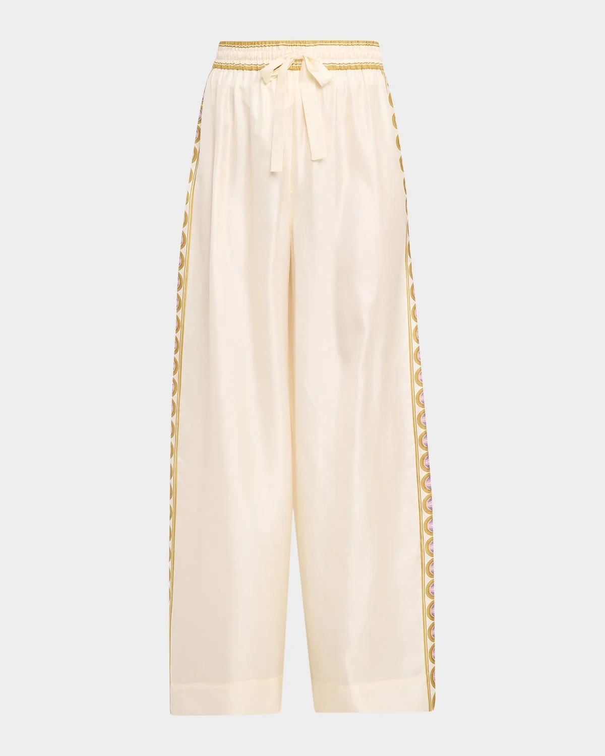 Crafted from lightweight silk, the Zimmermann "Luna Retro" track pants from the Kindred Spirit Collection & nbsp;feature & nbsp;geometric-print side paneling. Elasticated waist with self-tie drawcord Full length Wide legs Silk Lining: Viscose Dry clean Imported SIZE & FITModel measurements: 5 & apos;10" tallModel is wearing a US size 4/Small