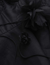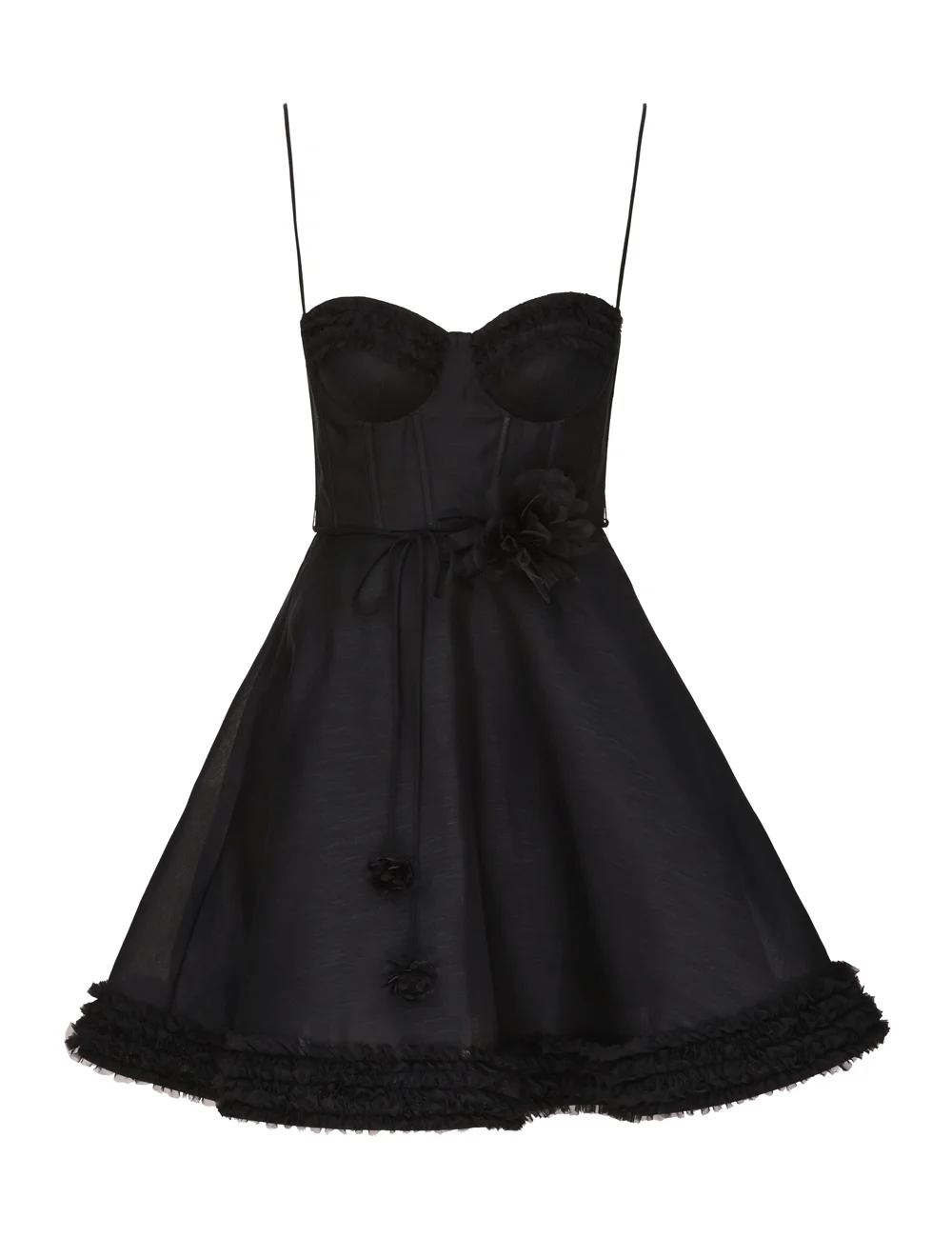 ITEM DETAILS The Luna Ruffle Mini Dress in Black from our Spring 2026 Collection, Kindred Spirit. A silk-linen blend mini dress featuring a sweetheart neckline, fitted bodice, rouleau self-tie straps, finished with a full flare skirt and soft fluff trim. - Silk-linen organza fabric - Corset bodice with panels - Ruched bust with internal boning - Shirred back bodice with invisible zip closure - Removable flower waist belt - Side seam pockets - Skirt is lined Style Code: 7569DS261 SIZE DETAILS 0P 0 1 2 3 4 Length 22 24 24 24.5 25 25 Waist 24.5 25 27.5 29 31.5 33 Fitted bodice, relaxed through the skirt Due to the boning structure, the bodice may feel restrictive Mid-weight, non-stretchy fabric This garment fits true to size Available in size 0P, suited to clients who are under 5'3"/ 160cm Model is 5'9.5"/178 cm, bust size 32C/10C and wears a size 0 Item measurements are in inches CARE INSTRUCTIONS Main: 55% linen, 45% silk; contrast: 100% polyester; lining: 100% cotton; decorative trim: 100% polyester Dry clean only code f (hydrocarbon only); Remove any detachable trims prior to dry cleaning; Cover to protect trim; Iron in low temperature with protective cloth; Light steam only; Do not spot clean Always check the label or care card for specific care instructions.