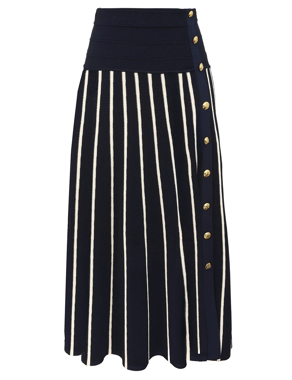 ITEM DETAILS The Luna Striped Midi Skirt in Navy/Cream from our Spring 2026 Collection, Kindred Spirit. A knit midi skirt featuring an elasticated waistband and functional right-side buttons. - Mid-rise, midi-length skirt - Elasticated waistband panel - Front buttons allow for flexible fit Style Code: 8734SS261 SIZE DETAILS 0P 0 1 2 3 4 Length 30 33 33 33 33 33 Waist 23.5 24.5 27 29 30.5 33 Hip 25 27 29 31.5 33 35.5 Elasticated waist for a flexible fit Mid-rise waist with a mid-length skirt Heavy-weight, stretchy fabric This garment fits true to size Available in size 0P, suited to clients who are under 5'3"/ 160cm Model is 5'9.5"/178 cm, bust size 32C/10C and wears a size 0 Item measurements are in inches CARE INSTRUCTIONS 85% viscose, 13% polyamide, 2% elastane Dry clean only code f (hydrocarbon only); Remove any detachable trims prior to dry cleaning; Cover to protect trim; Iron in low temperature with protective cloth; Do not spot clean; Store garment flat do not hang Always check the label or care card for specific care instructions.