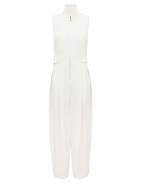 ITEM DETAILS The Luna Twill Jumpsuit in White from our Spring 2026 Collection, Kindred Spirit. A full-length jumpsuit featuring a stand collar with button detailing, centre front metal zip, finished with a shirred back panel and welt pockets. - Sleeveless, full-length jumpsuit - Stand collar with double button closure - Front metal zip for versatile fit - Pintucks through front legs - Shirred back belt - Topstitching throughout - Full bodice lining, partial leg lining Style Code: 7258US261 SIZE DETAILS 0P 0 1 2 3 4 Bust 34.5 37 38.5 41 42.5 45 Waist 30.5 32.5 34 36 38 40 Hip 50.5 53 54.5 56.5 58.5 60.5 Slightly fitted at the bodice Heavy-weight, non-stretchy fabric This garment fits true to size Available in size 0P, suited to clients who are under 5'3"/ 160cm Model is 5'9.5"/178 cm, bust size 32C/10C and wears a size 0 Item measurements are in inches CARE INSTRUCTIONS Main: 100% viscose; lining: 75% viscose, 25% silk Dry clean only code f (hydrocarbon only); Remove any detachable trims prior to dry cleaning; Cover to protect trim; Do not steam; Iron in low temperature with protective cloth; Do not spot clean Always check the label or care card for specific care instructions.