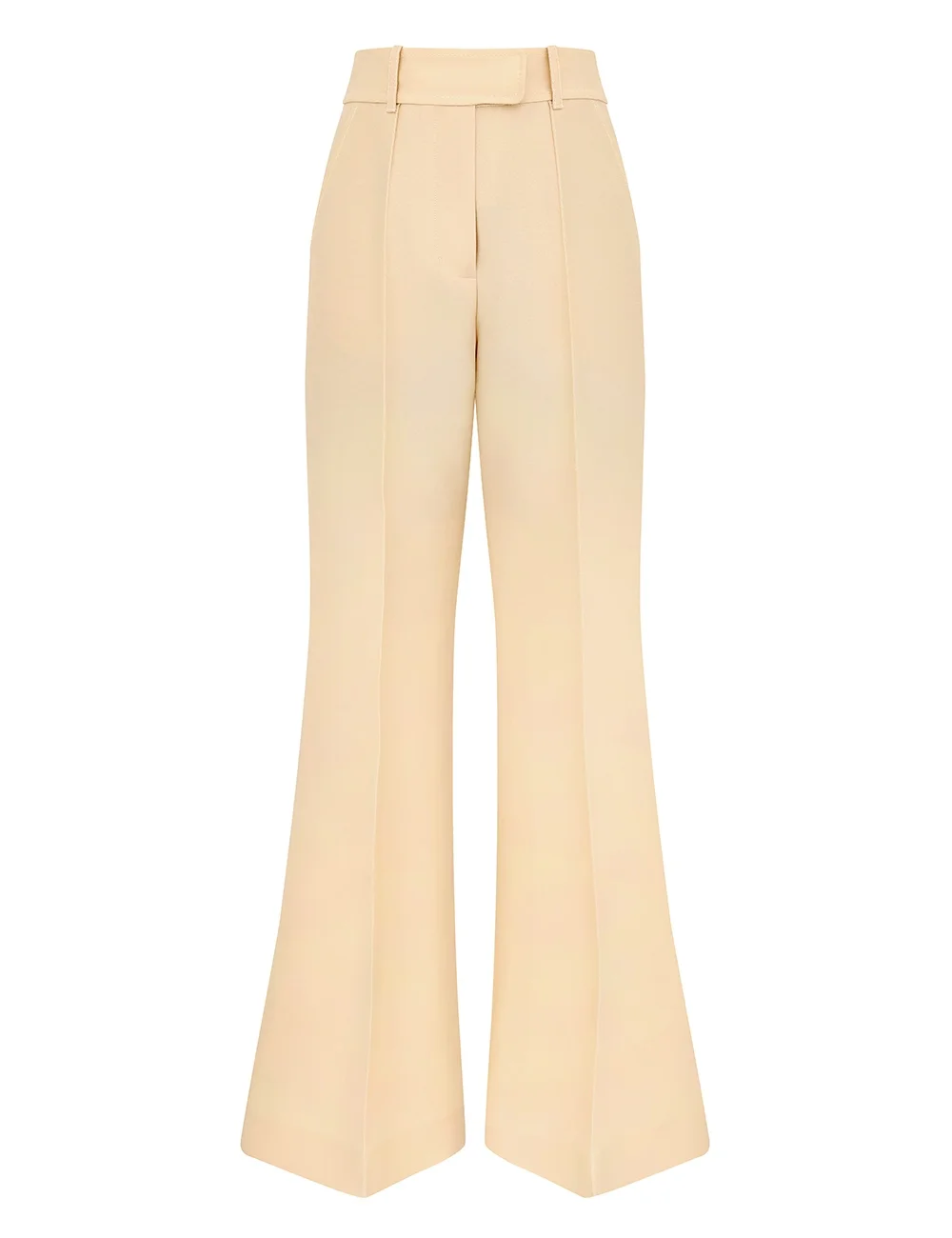ITEM DETAILS The Luna Wool Silk Flare Pant in Cream from our Spring 2026 Collection, Kindred Spirit. A silk-wool pant featuring a mid-rise waistband with hook and bar closure, centre front zip closure, finished with a wide flare hem. - Wool-silk blend fabric - High-rise, full-length pant - Fixed waistband with belt loops - Concealed front zip - Back welt pockets - Pintucks through front and back legs - Lined Style Code: 6490PS261 SIZE DETAILS 0P 0 1 2 3 4 Length 40 44 44.5 45 45 45.5 Waist 26 27.5 29 31.5 33 35.5 Hip 35.5 38 39.5 41.5 43.5 45.5 Inseam 31.5 34.5 34.5 34.5 34.5 34.5 Fitted at the waist and hips, relaxed through the legs Mid-rise waist with a full-length pant Mid-weight, non-stretchy fabric This garment fits true to size Available in size 0P, suited to clients who are under 5'3"/ 160cm Model is 5'9.5"/178 cm, bust size 32C/10C and wears a size 0 Item measurements are in inches CARE INSTRUCTIONS Main: 91% wool, 9% silk; pocketing: 75% viscose, 25% silk Dry clean only code f (hydrocarbon only); Remove any detachable trims prior to dry cleaning; Cover to protect trim; Iron in low temperature with protective cloth; Light steam only; Do not spot clean Always check the label or care card for specific care instructions.
