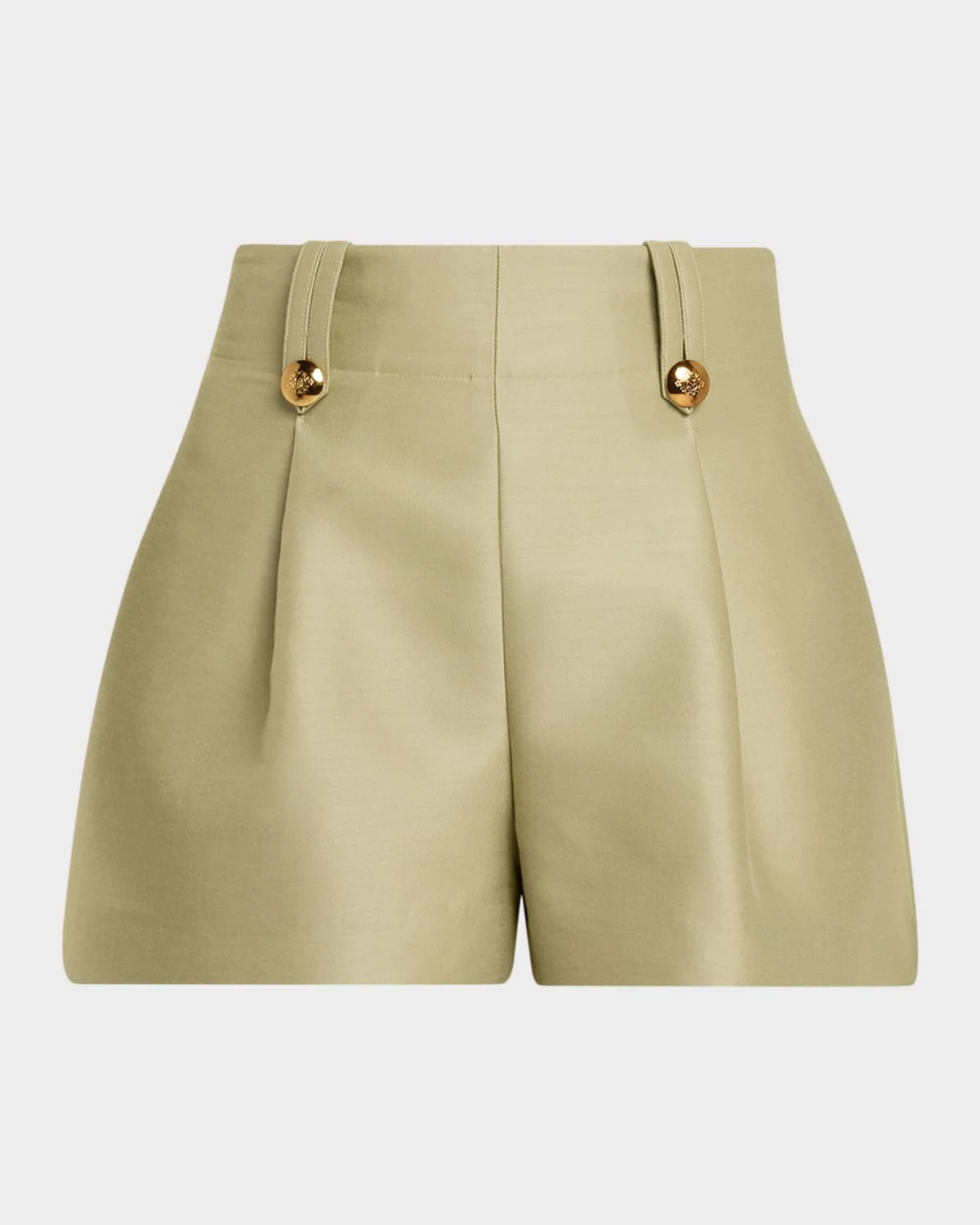 Crafted from a lustrous silk and wool blend, the "Luna" shorts by Zimmermann boast a flared, tailored silhouette adorned with golden buttons that add a touch of glamour. High rise Pintuck front & nbsp; Back welt pockets & nbsp; Waist-hugging fit & nbsp; Invisible back zip & nbsp; Wool/silk Lining: Viscose Dry clean Imported Size conversion: 0 = X-Small, 1 = Small, 2 = Medium, 3 = Large