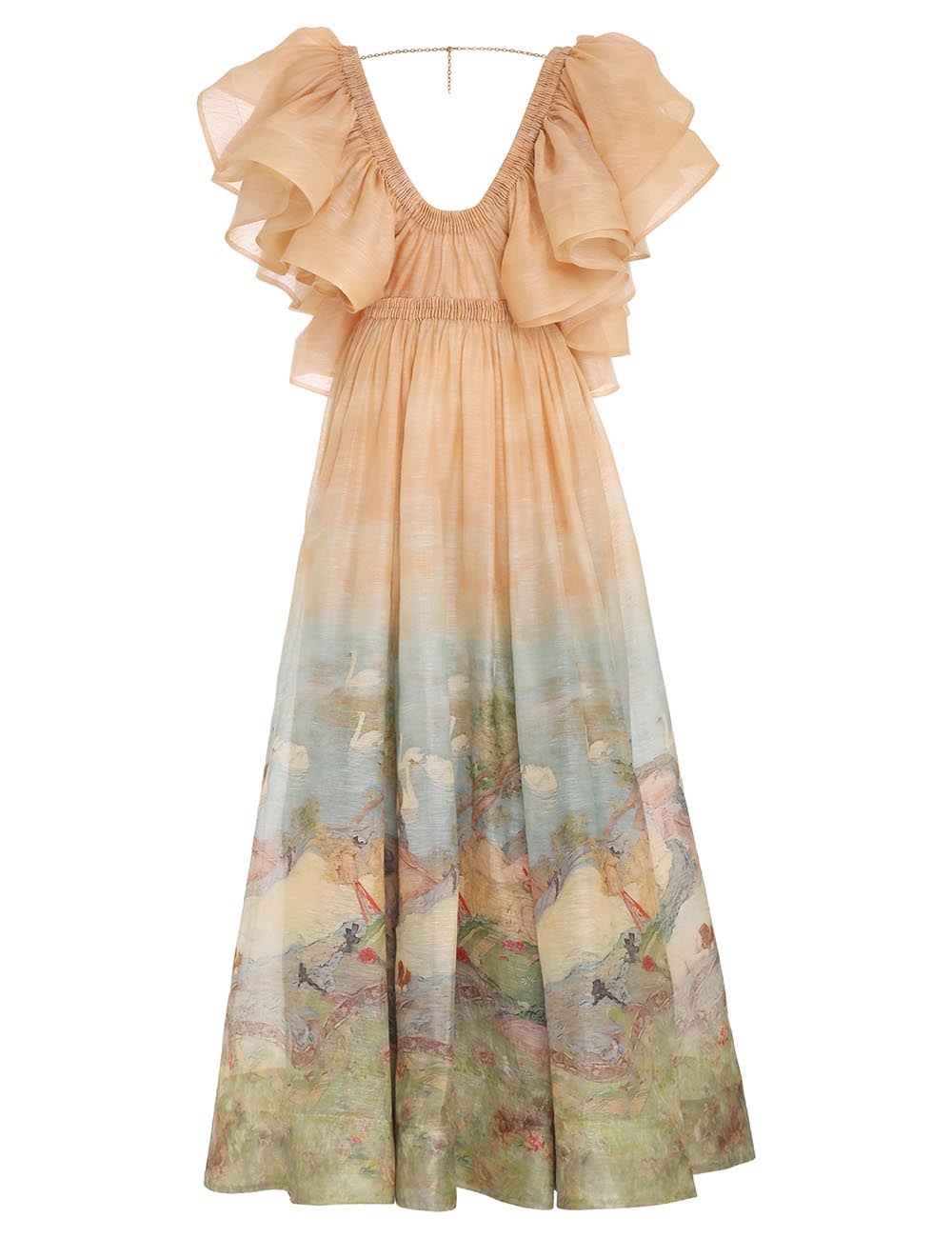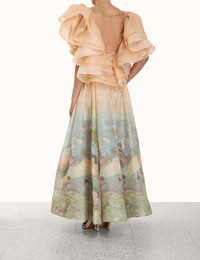 ITEM DETAILS The Lyrical Frill Neck Gown in Endormies Print from our Fall 2023 Collection, Luminosity. A silk linen organza gown featuring a frilled bodice and a back chain detail. - Silk linen gown - Ruched waist band - Invisible zip at centre back - Crinoline inserted at the hem and sleeve frills - Fabric based on Endormies, by Rupert Bunny Style Code: 8511DF232 SIZE DETAILS 0P 0 1 2 3 4 Length 111 120 120 120 120 120 Bust 84 88 94 100 104 110 Waist 66 70 74 80 84 90 Fitted through the bodice This garment fits true to size Available in size 0P, suited to clients who are under 5'3"/ 160cm Model is 5'9.5"/178 cm, bust size 32C/10C and wears a size 0 Fabric artwork based on 'Endormies' (c. 1904) by Rupert Bunny. Images courtesy of the National Gallery of Victoria, Melbourne. Item measurements have been rounded to the nearest cm. CARE INSTRUCTIONS Main: 55% linen 45% silk Contrast 1: 55% linen 45% silk Contrast 2: 100% polyester Lining: 100% cotton Exclusive of trims Dry clean only code f with protective bag Cool iron with protective cloth Light steam only Do not spot clean Cover and protect hardware Turn garment inside out before dry cleaning Always check the garment care label for specific care instructions.