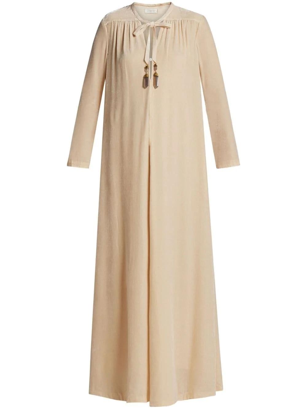 Lyrical Tubular velvet dress Laidback sophistication defines this ZIMMERMANN Lyrical Tubular dress. It’s crafted from light-beige velvet and enhanced with a self-tie fastening at the neck adorned with two dangling rock crystals. Highlights - Light beige - Velvet - Front tie fastening - Natural rock crystal - Long sleeves - Ankle-length - Straight hem Imported Composition Outer: Polyamide 100%, Viscose 80%, Silk 20% Lining: Viscose 100% Washing instructions Dry Clean Only