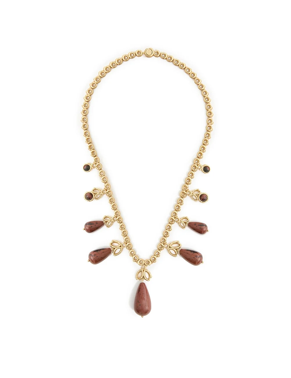 ITEM DETAILS The Maisie Charm Necklace in Antique Gold from our Fall 2025 Collection, Hypnotic. A gold plated chain necklace featuring a natural Mahogany Obsidian stone detailing and a custom centre back clasp. - 14KT gold plated brass - Natural Mahogany Obsidian stones - Custom plating standard with raw brass castings finish - Centre back clasp closure Style Code: 5044XF25A1 SIZE DETAILS One size. CARE INSTRUCTIONS 75% brass 25% mahogany obsidian Our semi-precious stones are hand-cut to enhance their natural beauty, with unique variations in each piece Zimmermann jewellery is made from 14kt gold-plated brass Please remove during exercise, showering, or swimming Keep away from perfumes, acetones, creams, and water to prevent damage or discoloration Clean gently with a soft, lint-free clothavoid cleaning products Store in a cool, dry place, away from direct sunlight and heat Always check the label or care card for specific care instructions.