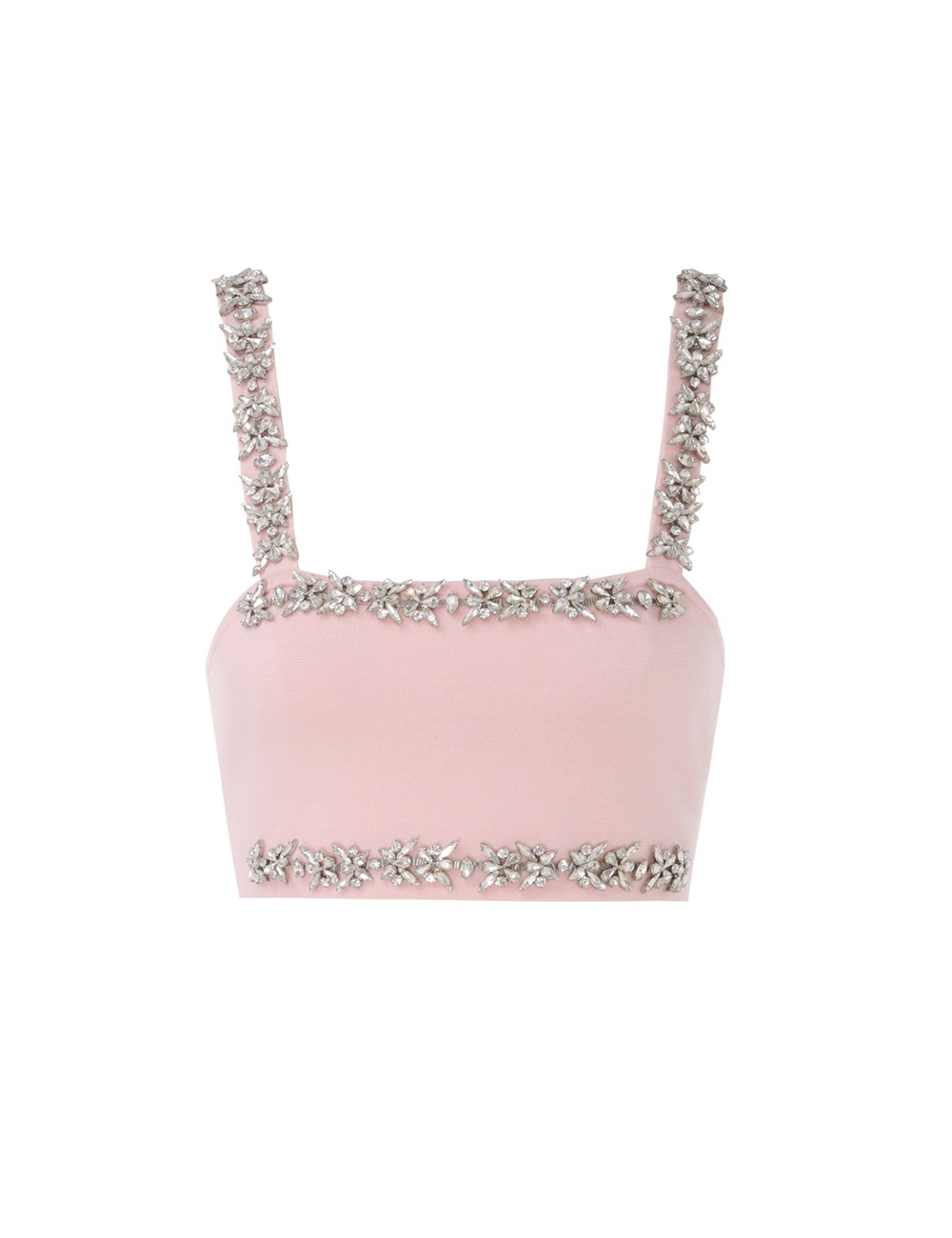 ITEM DETAILS The Matchmaker Bandeau Top in Dusty Pink from our Resort 2024 Collection, Matchmaker. A merino wool crop top, with trims of crystal throughout. - Merino wool - Bandeau crop top - Fixed straps - Slip on style Style Code: 9028TMAT SIZE DETAILS 0P 0 1 2 3 Length 14 14 14 14 14 Bust 60 66 70 76 82 Slim fit This garment fits true to size Available in size 0P, suited to clients who are under 5'3"/ 160cm Model is 5'9.5"/178 cm, bust size 32C/10C and wears a size 0 Item measurements have been rounded to the nearest cm. CARE INSTRUCTIONS 76% viscose 24% elastane Exclusive of trims Gentle cold hand wash separately with mild detergent Do not bleach Do not soak, wring or rub Do not tumble dry Dry flat inside out, away from direct sunlight Cool iron on reverse dry cleanable Always check the garment care label for specific care instructions.