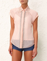ITEM DETAILS The Matchmaker Diamante Blouse in Pink from our Resort 2024 Collection, Matchmaker. A silk linen blouse featuring cuffed sleeves and crystal trims throughout. - Silk linen blouse - Concealed buttons down centre front - Classic collar with jewel trims - Raglan sleeves with stitched cuffs - Comes with separate cami Style Code: 8837TMAT SIZE DETAILS 0P 0 1 2 3 4 Bust 84 90 94 100 104 110 Waist 74 76 82 86 92 96 Sleeve 21 22 23 24 25 26 Straight fit throughout This garment fits true to size Available in size 0P, suited to clients who are under 5'3"/ 160cm Model is 5'9.5"/178 cm, bust size 32C/10C and wears a size 0 Item measurements have been rounded to the nearest cm. CARE INSTRUCTIONS Main:52% linen 48% silk Cami: 86% polyester 14% elastane Exclusive of trims Dry clean only code f (hydrocarbon) with protective bag Cool iron with protective cloth Light steam only Do not spot clean Cover and protect hardware Turn garment inside out before dry cleaning Cami: dry clean only code p with protective bag Turn garment inside out before dry cleaning Always check the garment care label for specific care instructions.