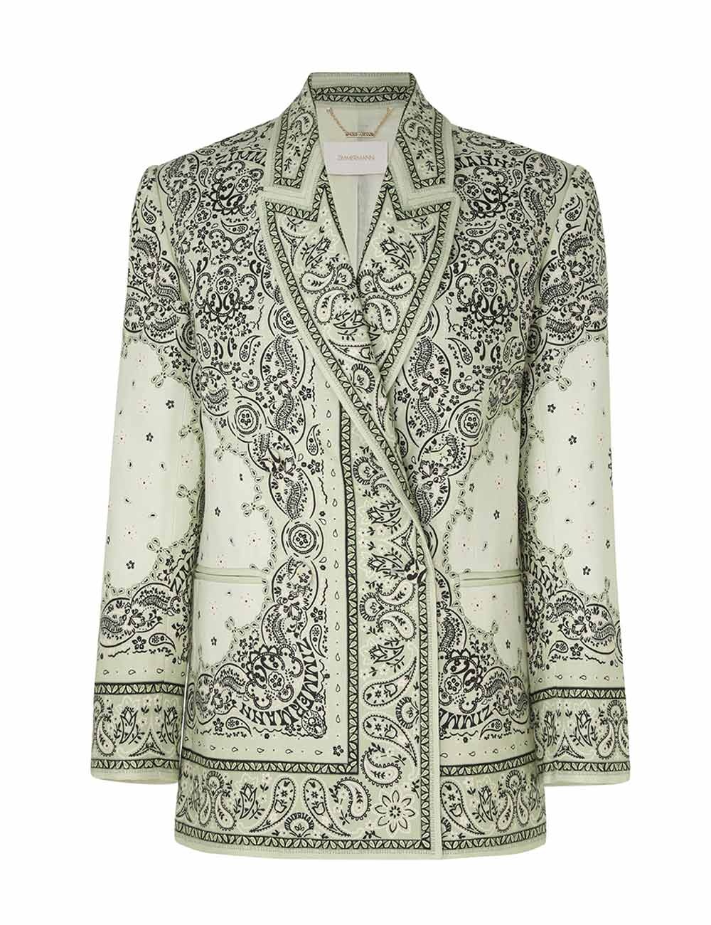 ITEM DETAILS The Matchmaker Duster Jacket in Mint Bandana from our Resort 2024 Collection, Matchmaker. A linen placement print blazer featuring jett pockets and a chest pocket. - Linen blazer - Double breasted - Internal buttons - Contrast binding Style Code: 9066JMAT SIZE DETAILS 0P 0 1 2 3 Length 71 75 76 77 77 Waist 94 100 104 110 114 Sleeve 59 63 63 64 64 Tailored fit This garment fits true to size Available in size 0P, suited to clients who are under 5'3"/ 160cm Model is 5'9.5"/178 cm, bust size 32C/10C and wears a size 0 Item measurements have been rounded to the nearest cm. CARE INSTRUCTIONS Main: 100% linen Lining: 100% cotton Exclusive of trims Dry clean only code f (hydrocarbon) with protective bag Cool iron with protective cloth Light steam only Do not spot clean Turn garment inside out before dry cleaning Always check the garment care label for specific care instructions.