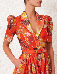 ITEM DETAILS The Matchmaker Midi Shirt Dress in Red Tropical Floral from our Resort 2024 Collection, Matchmaker. A silk linen midi dress featuring a plunging neckline and buttons down the centre front, finished with side seam pockets and a self cover belt. - Silk linen midi dress - Plunge V neckline - Shirt shape bodice - Lapel collar - Short cuffed sleeves - Removable belt - Comes with separate slip Style Code: 5567DMAT SIZE DETAILS 0P 0 1 2 3 4 Length 110 110 123 123 123 124 Bust 220 86 92 96 102 106 Waist 68 70 76 80 86 90 Sleeve 32 32 33 34 34 35 Fitted through bodice and waist Relaxed through skirt This garment fits true to size Available in size 0P, suited to clients who are under 5'3"/ 160cm Model is 5'9.5"/178 cm, bust size 32C/10C and wears a size 0 Item measurements have been rounded to the nearest cm. CARE INSTRUCTIONS 52% linen 48% silk exclusive of trims Slip: 86% polyester 14% elastane Exclusive of trims Remove belt before dry cleaning Dry clean only code f (hydrocarbon) with protective bag Cool iron with protective cloth Light steam only Do not spot clean Cover and protect hardware Turn garment inside out before dry cleaning Slip: dry clean only code p with protective bag Always check the garment care label for specific care instructions.