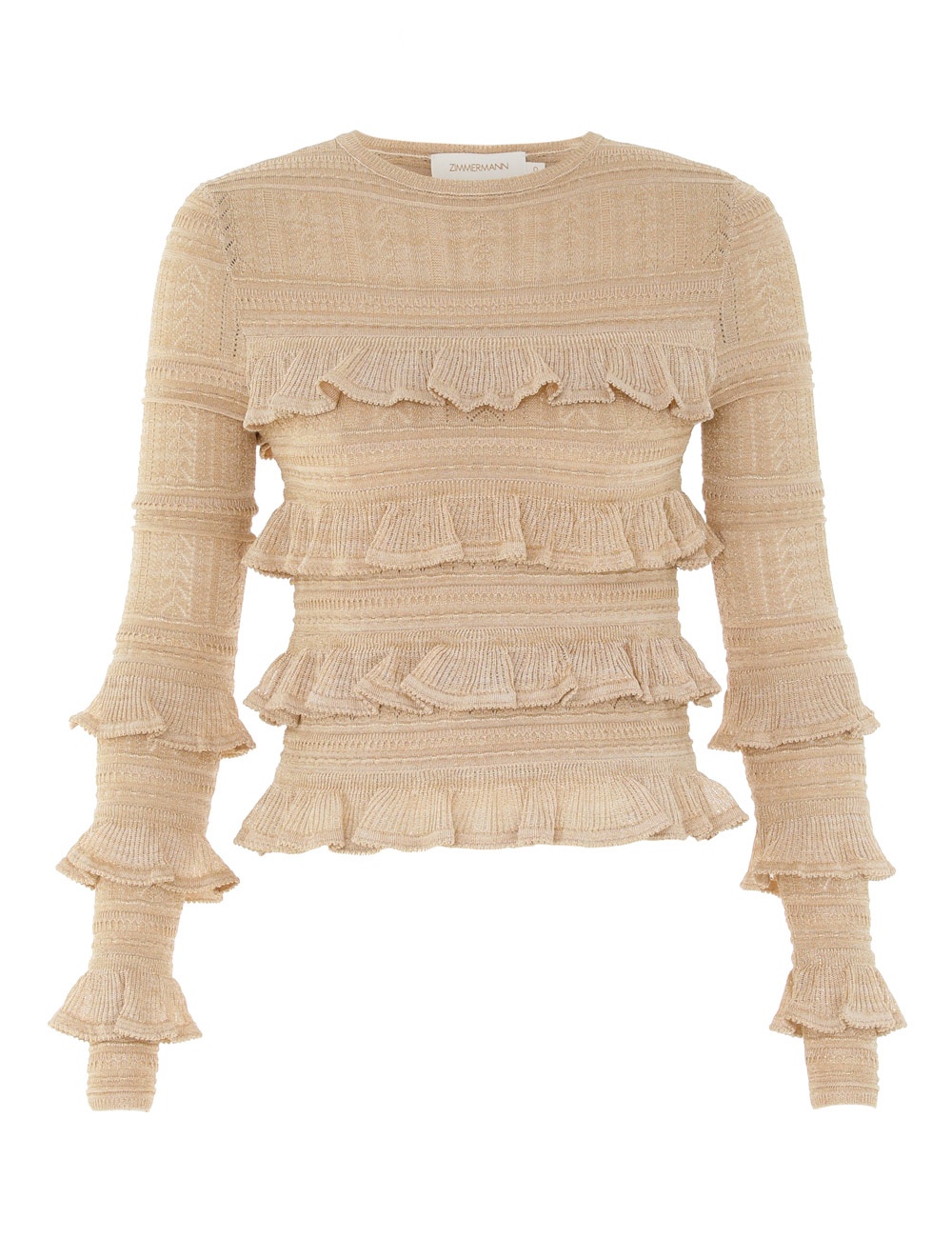 ITEM DETAILS The Ruffle Top in Gold Lurex from our Resort 2024 Collection, Matchmaker. A knit top featuring long sleeves and a scoop neck, finished with ruffles throughout. - Knit top - Long sleeves - Ruffled details throughout - Slip on style Style Code: 6496TMAT SIZE DETAILS 0P 0 1 2 3 Length 44 44 47 48 49 Bust 88 68 74 80 84 Sleeve 51 54 54 54 54 Slim fit This garment fits true to size Available in size 0P, suited to clients who are under 5'3"/ 160cm Model is 5'9.5"/178 cm, bust size 32C/10C and wears a size 0 Item measurements have been rounded to the nearest cm. CARE INSTRUCTIONS 55% viscose 33% polyamide 12% metallised fibre Exclusive of trims Dry clean only code f (hydrocarbon), inside out with protective bag Cool iron with protective cloth Do not spot clean Store garment flat, do not hang Always check the garment care label for specific care instructions.