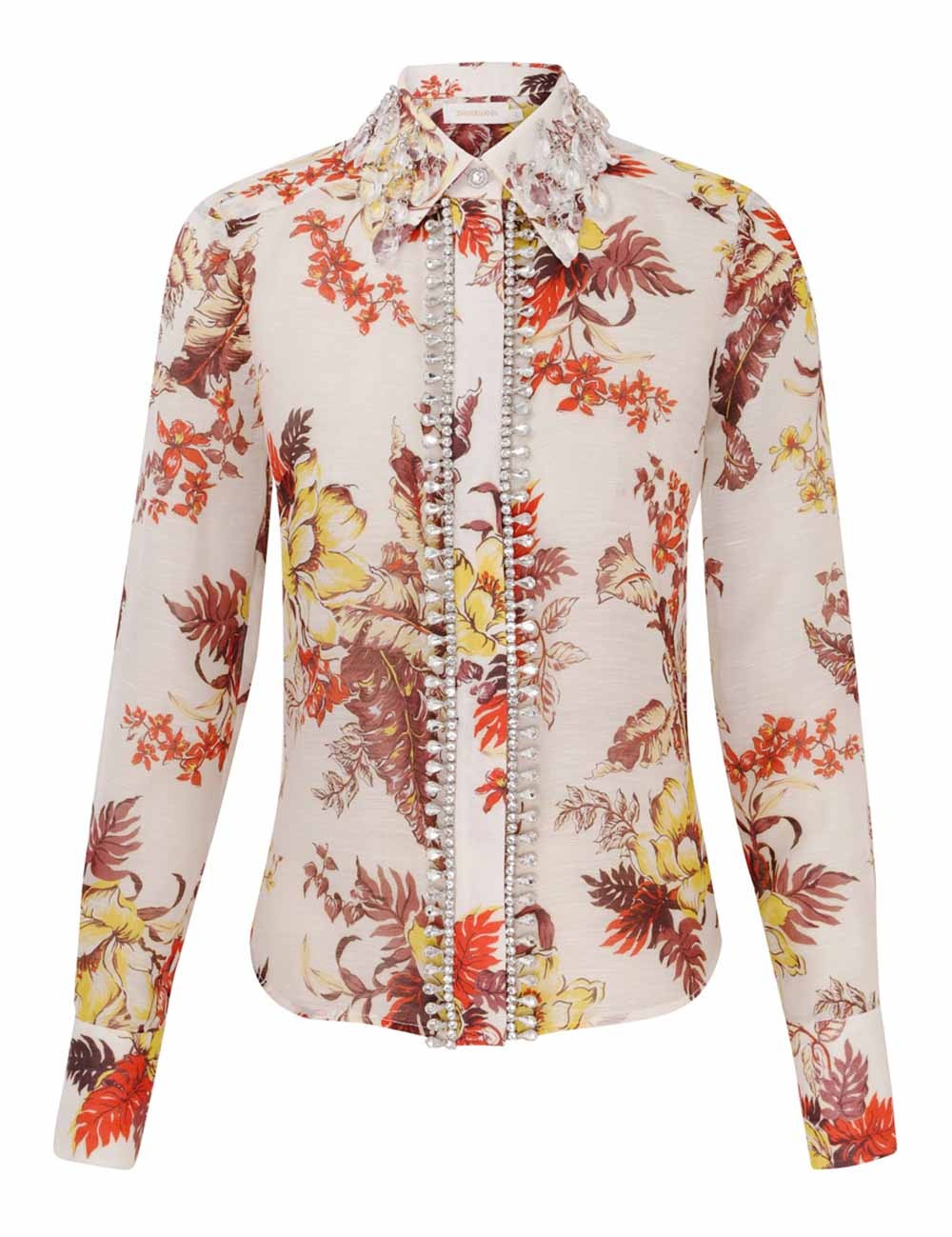 ITEM DETAILS The Matchmaker Tropical Shirt in Ivory Tropical Floral from our Resort 2024 Collection, Matchmaker. A silk linen shirt featuring long sleeves and crystal trims throughout. - Silk linen shirt - Concealed buttons down centre front - Classic collar with jewel trims - Buttoned cuffs - Comes with separate cami Style Code: 9206TMAT SIZE DETAILS 0P 0 1 2 3 4 Length 60 64 65 65 66 67 Bust 94 98 104 110 114 120 Sleeve 59 63 64 65 65 66 Slim fit This garment fits true to size Available in size 0P, suited to clients who are under 5'3"/ 160cm Model is 5'9.5"/178 cm, bust size 32C/10C and wears a size 0 Item measurements have been rounded to the nearest cm. CARE INSTRUCTIONS 52% linen 48% silk Exclusive of trims Dry clean only code f (hydrocarbon) with protective bag Cool iron with protective cloth Light steam only Do not spot clean cover and protect hardware Turn garment inside out before dry cleaning Always check the garment care label for specific care instructions.