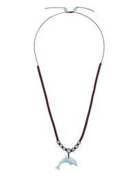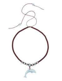 ITEM DETAILS The Mellow Dolphin Pendant in Aqua from our Spring 2025 Collection, Illumination. A macrame necklace featuring a custom cut natural Aquamarine stone in the shape of a dolphin, along with matching Aquamarine beads. - Aquamarine stones - Self tie cord closure with beads on ends - Satin cord chain Style Code: 3807XS25A1 SIZE DETAILS One size. CARE INSTRUCTIONS 95% aquamarine 5% polyester Our semi-precious stones are hand-cut to enhance their natural beauty, with unique variations in each piece; Zimmermann jewellery is made from 12kt gold-plated brass; Please remove during exercise, showering, or swimming; Keep away from perfumes, acetones, creams, and water to prevent damage or discoloration; Clean gently with a soft, lint-free cloth - avoid cleaning products; Store in a cool, dry place, away from direct sunlight and heat. Always check the label or care card for specific care instructions.