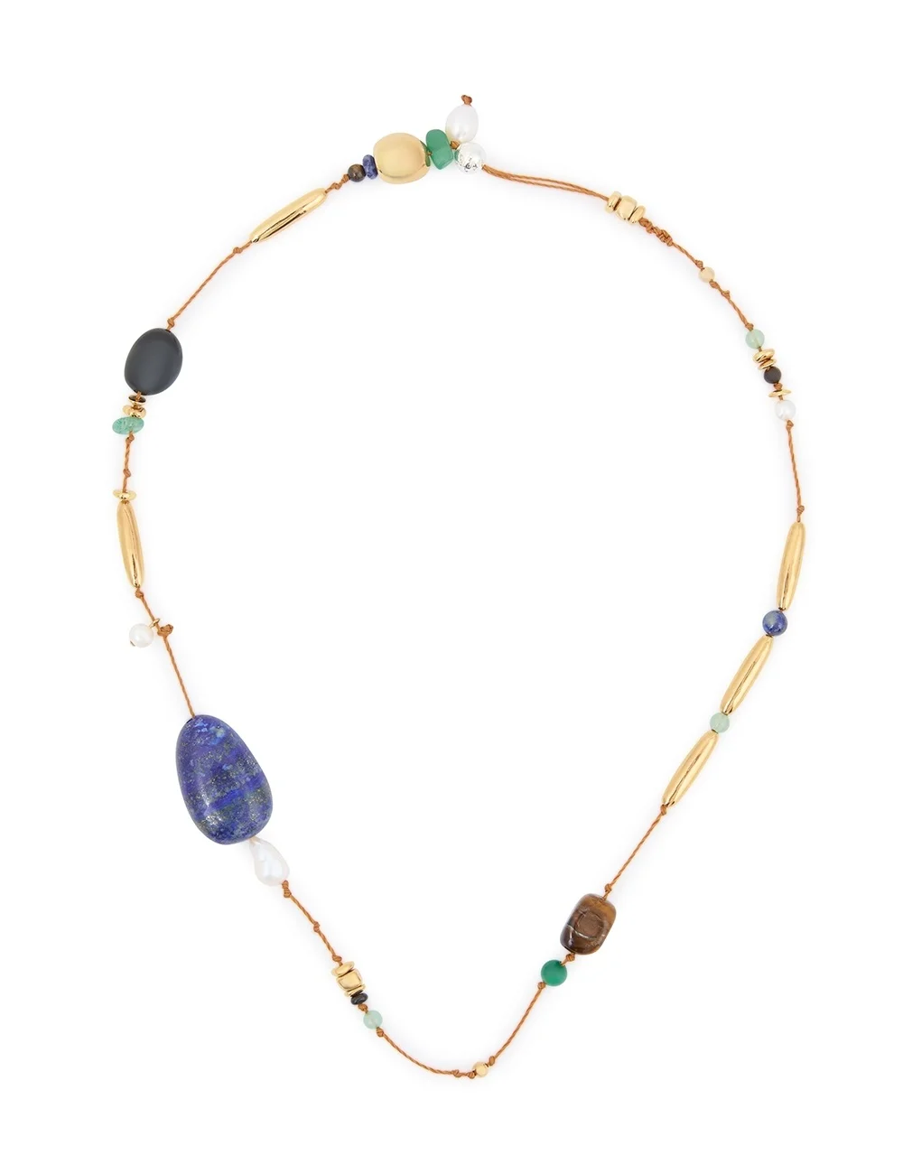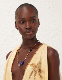 ITEM DETAILS The Mellow Stone Beaded Necklace in Gold/Multi from our Spring 2025 Collection, Illumination. A bead charm necklace featuring a natural Tiger's Eye, Green Quartz, Lapis, Aquamarine and Freshwater Pearl stones throughout. - Twisted rope - 12KT gold plated brass detailing - Natural Tiger's Eye, Green Quartz, Lapis, Aquamarine and Freshwater Pearl stones - Custom self stone clasp Style Code: 3696XS25A1 SIZE DETAILS One size. CARE INSTRUCTIONS 25% brass 10% aquamarine 10% red jade 10% freshwater pearls 10% lapis 10% black agate 10% green quartz 10% tigers eye 5% polyester Our semi-precious stones are hand-cut to enhance their natural beauty, with unique variations in each piece. ; Zimmermann jewellery is made from 12kt gold-plated brass. ; Please remove during exercise, showering, or swimming. ; Keep away from perfumes, acetones, creams, and water to prevent damage or discoloration. ; Clean gently with a soft, lint-free clothavoid cleaning products. ; Store in a cool, dry place, away from direct sunlight and heat. Always check the label or care card for specific care instructions.