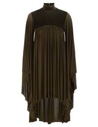 ITEM DETAILS The Memento Batwing Mini Dress in Olive from our Fall 2025 Collection, Hypnotic. A velvet mini dress featuring long batwing sleeves, heavy gathering throughout, a high neckline, and asymmetrical hem. - Mini-length dress - Long batwing sleeves with cascading hem - Heavily gathered throughout - Centre back invisible zip closure Runway: This style was featured on the F25 Runway. Style Code: 5563DF252 SIZE DETAILS 0P 0 1 2 3 4 Length 44.5 46.5 47 47 47 47.5 Bust 26 28.5 30 32.5 34 36 Sleeve 20.5 22 22 22 22 22 Designed for a relaxed, oversized fit This garment fits true to size Available in size 0P, suited to clients who are under 5'3"/ 160cm Model is 5'9.5"/178 cm, bust size 32C/10C and wears a size 0 Item measurements are in inches CARE INSTRUCTIONS Main: 90% viscose, 10% elastane; contrast: 95% polyester, 5% elastane Dry clean only code f (hydrocarbon only); Remove any detachable trims prior to dry cleaning; Cover to protect trim; Do not steam; Cool iron with protective cloth; Do not spot clean Always check the label or care card for specific care instructions.