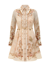 ITEM DETAILS The Memento Buttoned Mini Dress in Map Print from our Fall 2025 Collection, Hypnotic. A silk linen organza mini dress featuring a classic collar, long sleeves, buttons down the centre front and a full flare skirt. - Silk linen organza - Long sleeves with buttoned cuffs - Fitted at waist with removable belt - Side seam pockets - Functional buttons down centre front opening - Placement printed - Comes with a separate slip - Skirt is lined Style Code: 5368DF252 SIZE DETAILS 0P 0 1 2 3 4 Length 31.5 33.5 34 34.5 35 36 Bust 33 35.5 37 38 41 43.5 Waist 27 27.5 30 32.5 34 36 Designed to be fitted at the bust and waist, loose at the hip This garment fits true to size Available in size 0P, suited to clients who are under 5'3"/ 160cm Model is 5'9.5"/178 cm, bust size 32C/10C and wears a size 0 Item measurements are in inches CARE INSTRUCTIONS Main: 53% linen, 47% silk; contrast: 100% polyester; skirt lining: 100% viscose; slip: 86% recycled polyester, 14% elastane Dry clean only code f (hydrocarbon only); Remove any detachable trims prior to dry cleaning; Cover to protect trim; Cool iron with protective cloth; Light steam only; Do not spot clean Gentle cold hand wash separately with mild detergent Remove any detachable trims prior to cleaning Cover to protect trim; Do not soak, rub or wring Do not bleach Do not tumble dry Dry flat in shade Cool iron with protective cloth Do not spot clean Dry cleanable code p Always check the label or care card for specific care instructions.