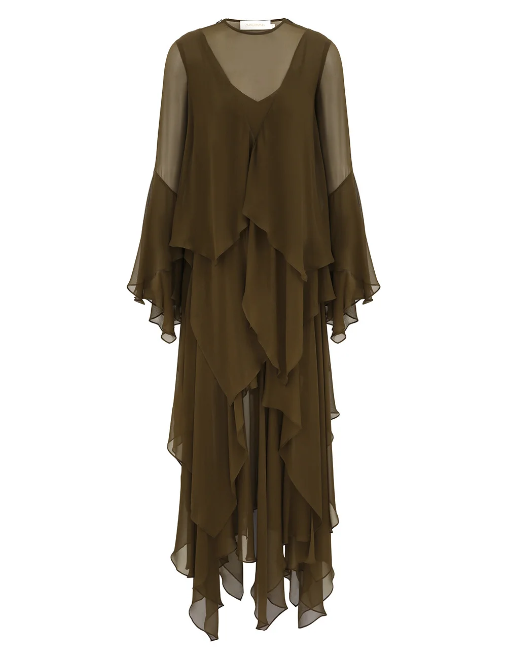 ITEM DETAILS The Memento Cascading Maxi Dress in Moss from our Fall 2025 Collection, Hypnotic. A silk maxi dress featuring a rounded neckline, sheer panelling throughout, finished with cascading frill detailing. - Main gown is 100% silk fabric - Long sleeves with wide, cascading cuffs - Asymmetric hankie panels throughout - Invisible zip at left side seam - Concealed zips on each shoulder seam - Comes with separate slip Style Code: 6073DF252 SIZE DETAILS 0P 0 1 2 3 4 Length 56.5 60.5 61 61.5 61.5 62 Bust 32.5 34.5 37 38.5 41 42.5 Waist 26 27 29 31.5 33 35.5 Hip 36 38 40 42.5 44 46.5 Designed for a slightly loose fit, with a closer fit at the bust This garment fits true to size Available in size 0P, suited to clients who are under 5'3"/ 160cm Model is 5'9.5"/178 cm, bust size 32C/10C and wears a size 0 Item measurements are in inches CARE INSTRUCTIONS Main: 100% silk; slip: 100% viscose Dry clean only code f (hydrocarbon only); Remove any detachable trims prior to dry cleaning; Cover to protect trim; Cool iron with protective cloth; Light steam only; Do not spot clean Dry clean only code f (hydrocarbon only); Cover to protect trim; Cool iron with protective cloth; Do not spot clean ; Always check the label or care card for specific care instructions.