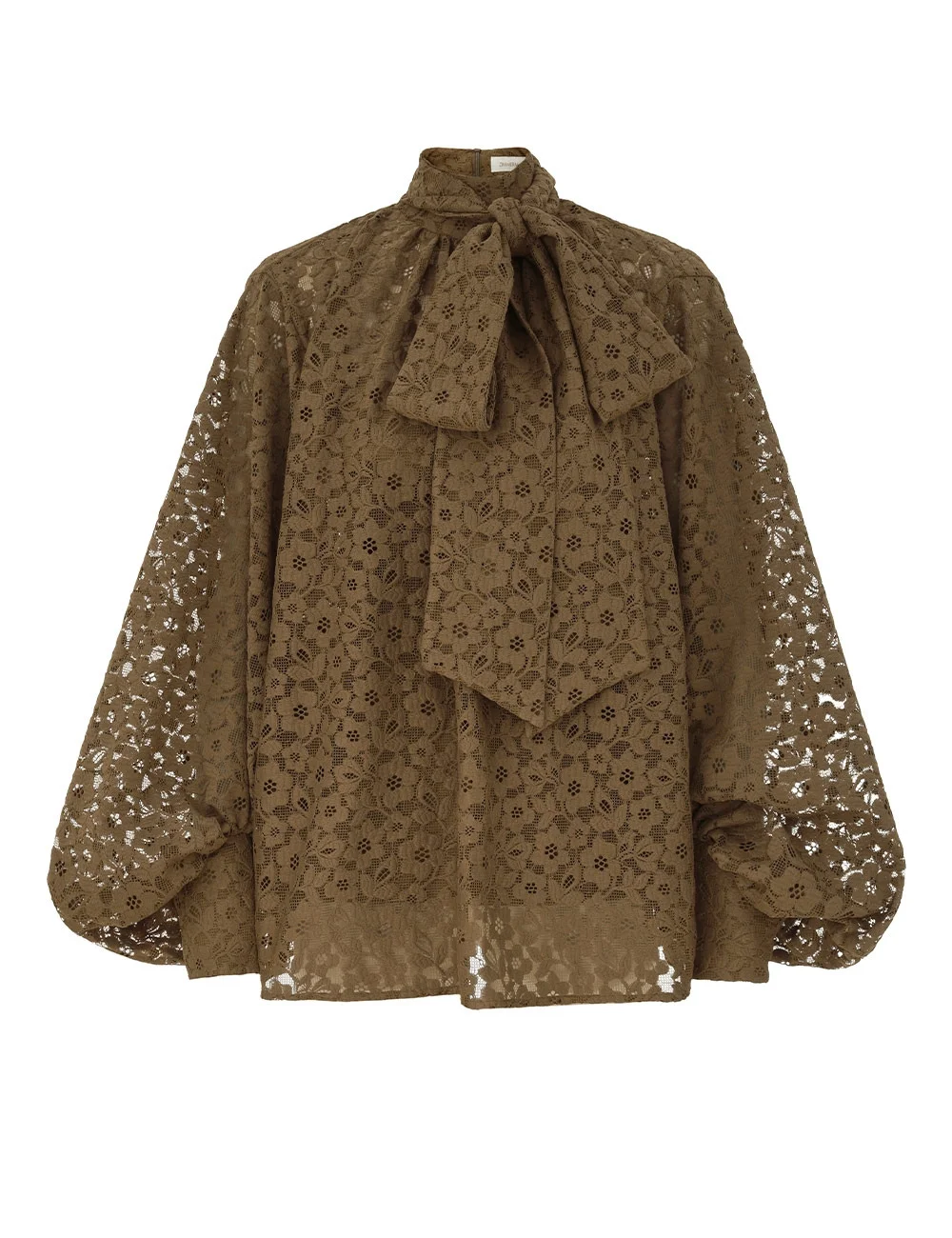 ITEM DETAILS The Memento Lace Shirt in Khaki from our Fall 2025 Collection, Hypnotic. A lace shirt featuring a stand collar, pussybow necktie and long blouson sleeves with elongated cuffs. - Lace blouse with stand collar - Elongated, fitted cuffs with zip closures - Removeable pussybow necktie - Invisible centre back zip closure - Asymmetrical hem - Comes with a separate cami Style Code: 5192TF252 SIZE DETAILS XS S M L Length 26.5 28 28.5 29 Sleeve 25 27 27 27 Designed for an oversized, loose fit This garment fits true to size Model is 5'10.5"/179 cm, bust size 34C/12C and wears a size S (equivalent to size 0) Item measurements are in inches CARE INSTRUCTIONS Main: 100% polyester; slip: 86% recycled polyester, 14% elastane Dry clean only code f (hydrocarbon only); Remove any detachable trims prior to dry cleaning; Cover to protect trim; Do not steam; Cool iron with protective cloth; Do not spot clean Gentle cold hand wash separately with mild detergent Remove any detachable trims prior to cleaning Cover to protect trim; Do not soak, rub or wring Do not bleach Do not tumble dry Dry flat in shade Cool iron with protective cloth Do not spot clean Dry cleanable code p Always check the label or care card for specific care instructions.