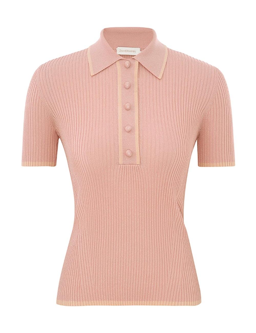 ITEM DETAILS The Metallic Polo in Peach from our Spring 2024 Collection, Natura. A knitted polo shirt featuring a classic collar and buttons down centre front. - Fitted knit - Classic collar - Self cover buttons at centre front bust - Short sleeves Style Code: 9773TRS24 SIZE DETAILS 0P 0 1 2 3 Length 53 56 57 57 58 Bust 41 46 51 56 61 Sleeve 21 21 22 23 23 Slim fit This garment fits true to size Available in size 0P, suited to clients who are under 5'3"/ 160cm Model is 5'9.5"/178 cm, bust size 32C/10C and wears a size 0 Item measurements have been rounded to the nearest cm CARE INSTRUCTIONS 76% viscose 24% elastane Exclusive of trims Gentle cold hand wash separately with mild detergent Do not bleach Do not soak, wring or rub Do not tumble dry Dry flat inside out, away from direct sunlight Cool iron on reverse Dry cleanable Always check the care label for specific care instructions.