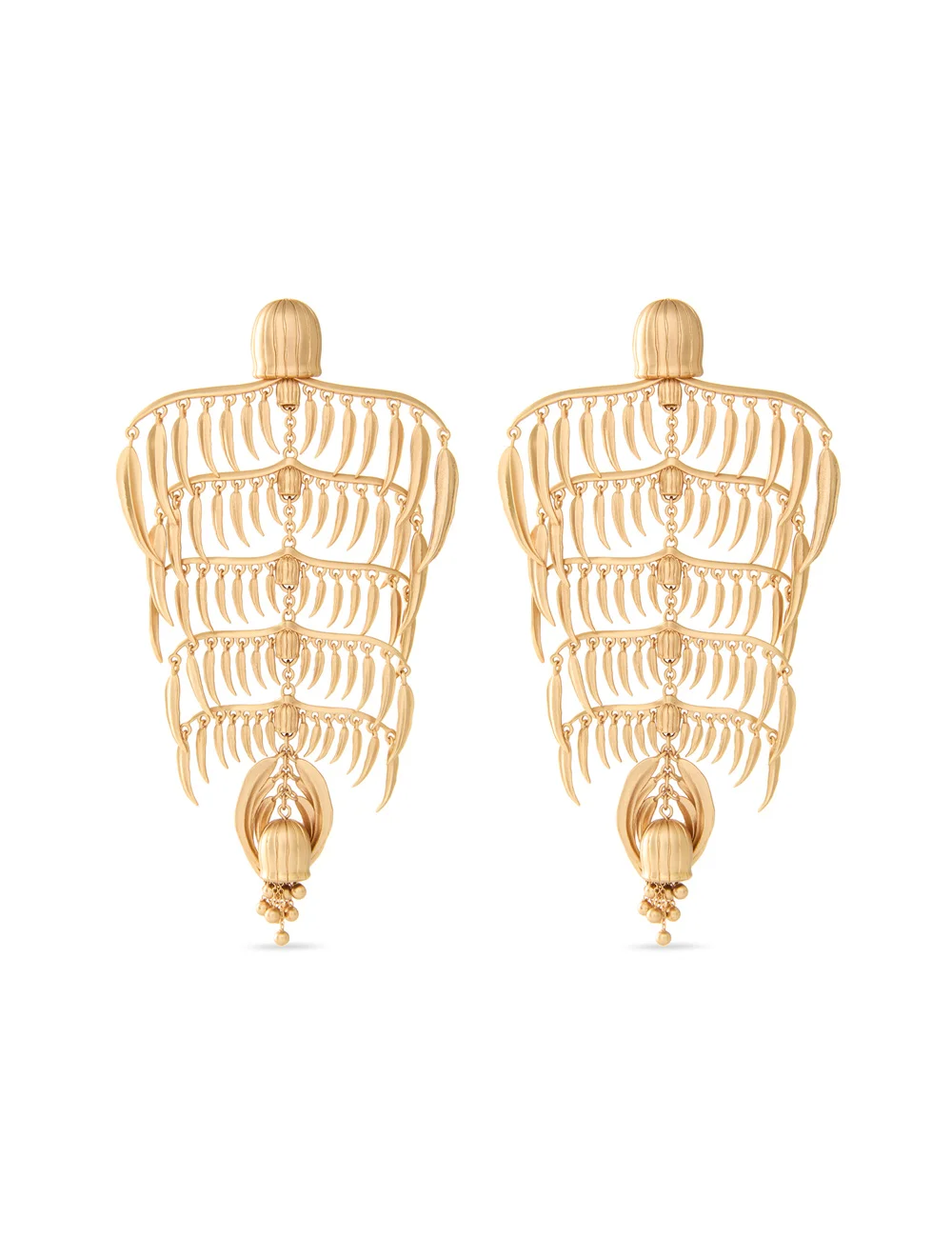 ITEM DETAILS The Mira Chandelier in Gold from our Spring 2026 Collection, Kindred Spirit. A gold plated chandelier earring featuring leaf drop detailing and a stud post back. - 16KT gold plated brass earrings - Tiered leaf drops throughout - Stud post back - Sold as a pair Style Code: 8482XS26A1 SIZE DETAILS Suitable for pierced ears. Sold as a pair. CARE INSTRUCTIONS 16 karat gold plated brass; post: stainless steel Zimmermann jewellery is made from 16kt gold-plated brass Please remove during exercising, showering or swimming Avoid contact with perfumes, acetones, creams, and water to prevent damage or discoloration Clean gently with a soft, lint-free cloth. Avoid cleaning products Store in a cool, dry place, away from direct sunlight and heat Always check the label or care card for specific care instructions.