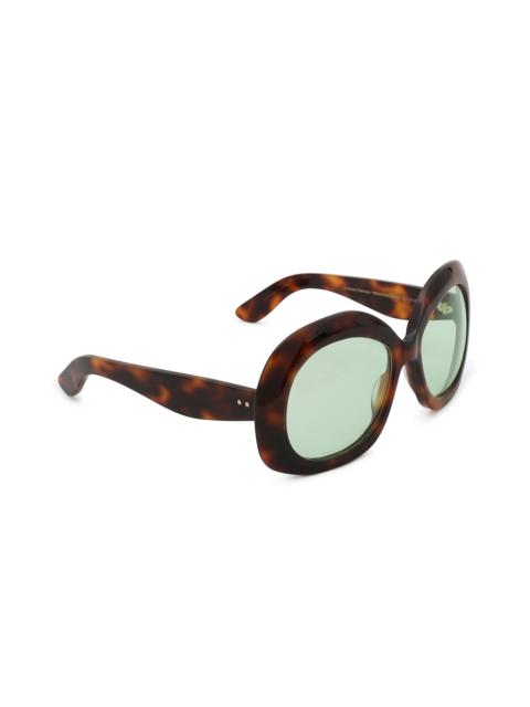 ITEM DETAILS The Miranda Oversize in Moss from our Fall 2025 Collection, Hypnotic. An oversized round frame featuring signature wood-effect acetate, solid lenses and softly rounded bevelling. - Wood-effect acetate frame - Solid coloured lenses - Rounded bevelling - Category 1 lenses - Comes with ZIMMERMANN case, dust bag and storage box Style Code: 6004XF25A1 SIZE DETAILS Oversized frame. LENS: Moss: Category 1 Orange: Category 1 FRAME: Lens: 57mm Nose bridge: 17mm Temple length: 135mm CARE INSTRUCTIONS Acetate Comes with a case and dust bag. Clean your sunglasses by gently rubbing them with a lens cleaning cloth and a liquid cleaner specifically designed for eyewear lenses. Whenever setting down your frames, place them lens side up to avoid scratching. When frames are not being worn, place them inside the protective case. Avoid leaving your sunglasses in the car, especially on hot days, to prevent warping. Wearing sunglasses on the top of your head can stretch the hinges over time - avoid if possible. Always check the label or care card for specific care instructions.