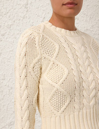 ITEM DETAILS The Natura Cable Sweater in Cream from our Spring 2024 Collection, Natura. A long sleeve sweater featuring a cable knit throughout. - Knitted sweater - Scoop neckline - Slip on style Style Code: 9779TS241 SIZE DETAILS 0P 0 1 2 3 Length 45 48 49 50 50 Bust 78 82 88 92 98 Waist 68 72 78 82 88 Sleeve 56 60 61 62 62 Fitted This garment fits true to size Available in size 0P, suited to clients who are under 5'3"/ 160cm Model is 5'9.5"/178 cm, bust size 32C/10C and wears a size 0 Item measurements have been rounded to the nearest cm. CARE INSTRUCTIONS 76% viscose 24% elastane Exclusive of trims Gentle cold hand wash separately with mild detergent Do not bleach Do not soak, wring or rub Do not tumble dry Dry flat inside out, away from direct sunlight Cool iron on reverse Dry cleanable Always check the garment care label for specific care instructions.