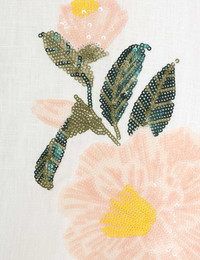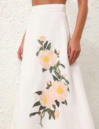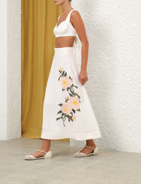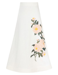 ITEM DETAILS The Natura Flare Skirt in Ivory Camellia from our Spring 2024 Collection, Natura. A silk linen organza midi skirt featuring a placement flower sequin embroidery and a flared silhouette. - Silk linen midi skirt - Placement embroidery - Crinoline hem - Tulle petticoat - Zip at centre back with hook and eye - French side seams Style Code: 9811SS241 SIZE DETAILS 0P 0 1 2 3 4 Length 76 84 84 84 84 84 Waist 66 68 74 78 84 88 Fixed high waist Relaxed through hips and legs This garment fits true to size Available in size 0P, suited to clients who are under 5'3"/ 160cm Model is 5'9.5"/178 cm, bust size 32C/10C and wears a size 0 Item measurements have been rounded to the nearest cm CARE INSTRUCTIONS Main: 100% linen Lining: 100% cotton Trim: 100% nylon Exclusive of trims Dry clean only code f (hydrocarbon) with protective bag Cool iron with protective cloth Light steam only Do not spot clean Turn garment inside out before dry cleaning Always check the care label for specific care instructions.