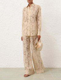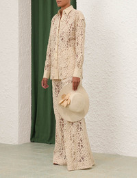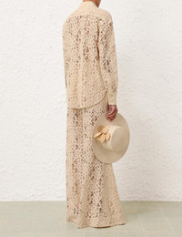 ITEM DETAILS The Natura Lace Pant in Tea from our Spring 2024 Collection, Natura. A lace pant featuring a high waisted and wide leg silhouette. - Lace pant - Flared leg - Hook and bar closure with internal jigger button - French seams - Back pockets Style Code: 9891PS241 SIZE DETAILS 0P 0 1 2 3 4 Length 103 111 112 112 113 114 Waist 70 74 78 84 88 94 Hip 108 112 118 122 128 132 Fixed high waist This garment fits true to size Available in size 0P, suited to clients who are under 5'3"/ 160cm Model is 5'9.5"/178 cm, bust size 32C/10C and wears a size 0 Item measurements have been rounded to the nearest cm CARE INSTRUCTIONS Main: 79% cotton 21% polyamide Lining: 100% cotton Exclusive of trims Dry clean only code f (hydrocarbon) with protective bag Cool iron with protective cloth Light steam only Do not spot clean Turn garment inside out before dry cleaning Always check the care label for specific care instructions.