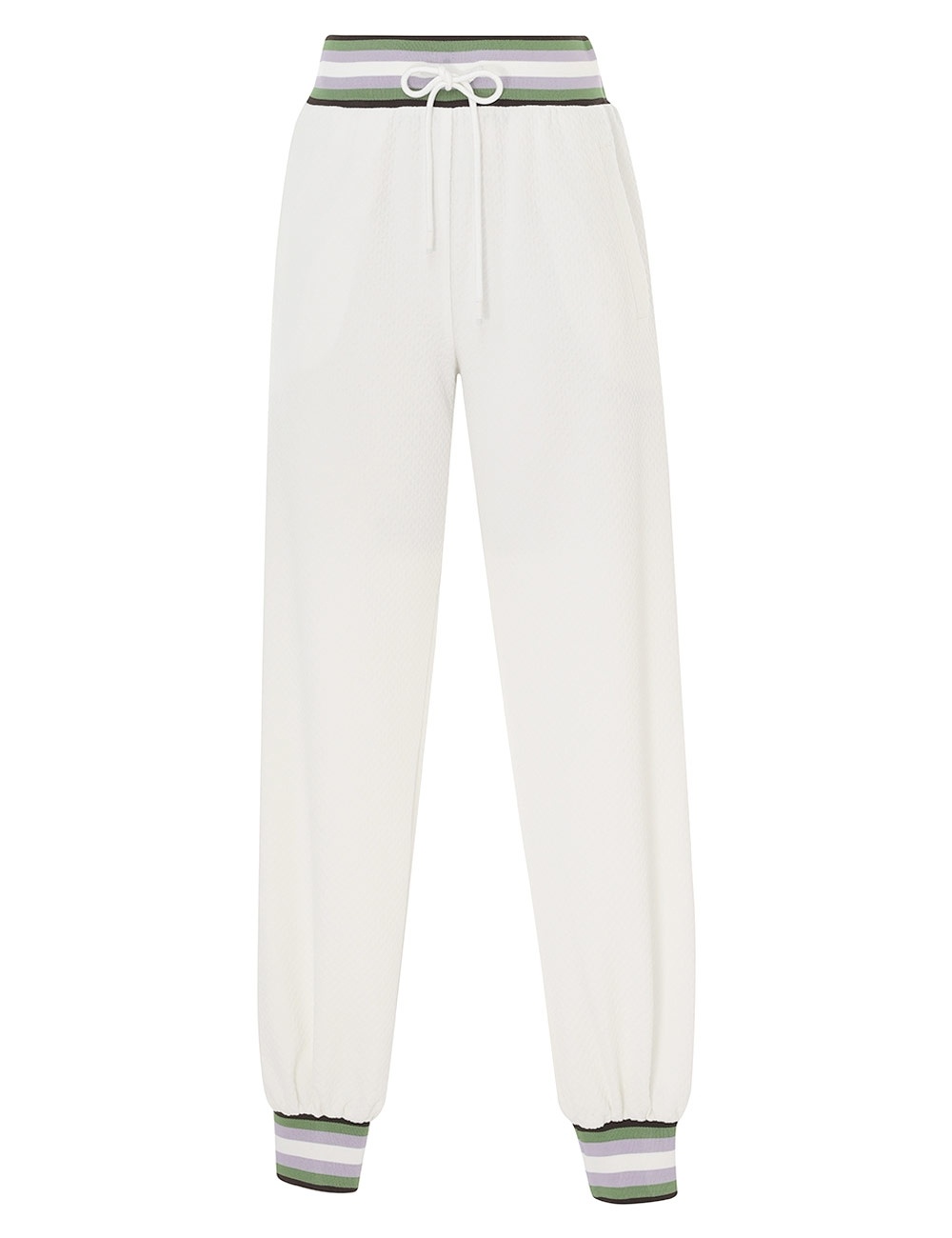 ITEM DETAILS The Natura Textured Track Pant in Ivory from our Spring 2024 Collection, Natura. A textured pant featuring a two tone elasticated waistband and elasticated cuffs. - Textured track pant - Two tone waistband and cuffs - Drawstring waist with tassel ends - Side seam pockets - Fleece lining Style Code: 1174PS241 SIZE DETAILS 0P 0 1 2 3 Length 84 91 92 93 93 Waist 64 68 72 78 82 Hip 96 102 106 112 116 Inseam 63 69 69 69 69 Slim fit This garment fits true to size Available in size 0P, suited to clients who are under 5'3"/ 160cm Model is 5'9.5"/178 cm, bust size 32C/10C and wears a size 0 Item measurements have been rounded to the nearest cm CARE INSTRUCTIONS Main: 95% polyester, 5% elastane Pocketing: 100% cotton Exclusive of trims Dry clean only code p Do not iron Light steam only Do not spot clean Always check the garment care label for specific care instructions.
