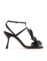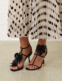 ITEM DETAILS The Orchid Sandal 85 in Black from our Spring 2025 Collection, Illumination. A heeled sandal featuring an asymmetric orchid flower design and gold buckle hardware. - Leather stiletto sandal - Made in Italy - Square toe - Asymmetric fixed orchid design - Ankle strap with gold buckle hardware - Grosgrain upper with leather orchid and leather outsole - 85mm stiletto heel Style Code: 3442FS25A1 SIZE DETAILS This shoe fits true to size. CARE INSTRUCTIONS Lining: 100% leather, sock lining-sottopiede: 100% leather, outsole-suola: 100% leather, main: 100% viscose, contrast: 100% leather Patent leather care:; The high gloss of patent leather may reduce over time. ; To remove scuffs, use a soft pencil eraser, and clean with soapy water and a microfiber cloth. ; Avoid harsh chemicals and direct sunlight. ; Store in the original dust bag, away from heat, never in plastic bag. Textile care:; To maintain optimal condition, apply a pfas-free waterproofing spray to the entire item and spot-clean stains with mild detergent. ; Rinse thoroughly to remove any soap residue, and air dry away from direct sunlight. ; If needed, gently brush with a soft brush. ; Please note, the material may lose some stiffness over time. ; For printed materials, pigments may transfer through fibers, so handle with care. ; Avoid contact with pigmented materials to prevent staining. Store in a dry, moisture-free environment in its dust bag. Always check the label or care card for specific care instructions.