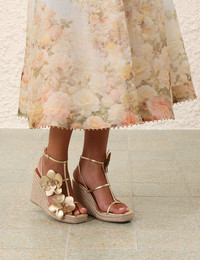 ITEM DETAILS The Orchid Wedge 110 in Gold from our Summer Swim 2025 Collection. A wedge heel featuring a statement orchid flower design and a buckle ankle fastening. - Wedge sandal - Soft square toe - Ankle strap with gold buckle hardware - 110mm heel - Made in Spain Style Code: 3447FS25A2 SIZE DETAILS This shoe fits true to size. CARE INSTRUCTIONS Lining: 100% leather; sock lining-sottopiede: 100% leather; outsole-suola: 100% thermoplastic polyurethane (tpu); main: 100% leather Metallic leather care:; Due to the delicate nature of the metallic coating on the leather please note that over time, this metallic coating may eventually wear off. This is a natural characteristic of metallic coating on leather and this may wear at an advanced rate in areas that receive more regular contact. Be careful when wearing to avoid objects that can disturb the surface as scratches can remove, disrupt or lift the metallic coating. Always check the label or care card for specific care instructions.
